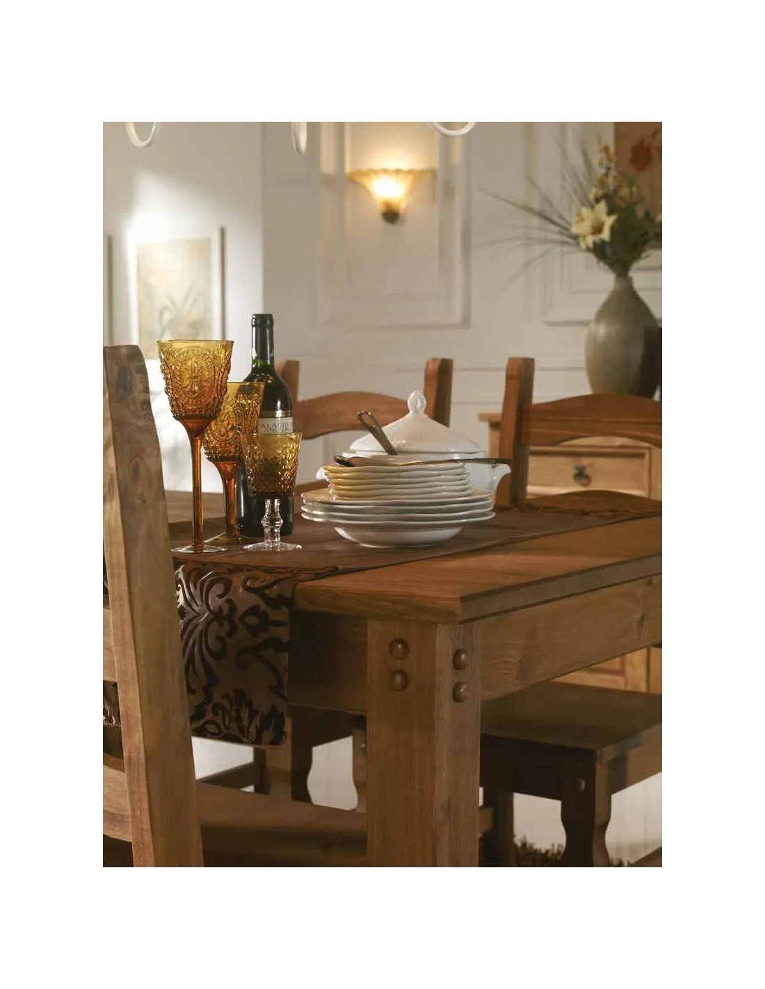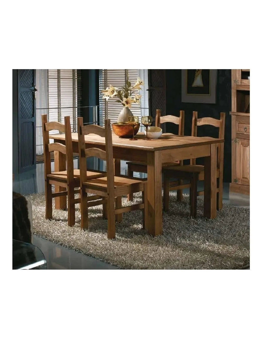 Este conjunto de comedor colonial está compuesto por una mesa de comedor extensible acompañada de 4 o 6 sillas. Diseño inspirado en los muebles de estilo rústico colonial.