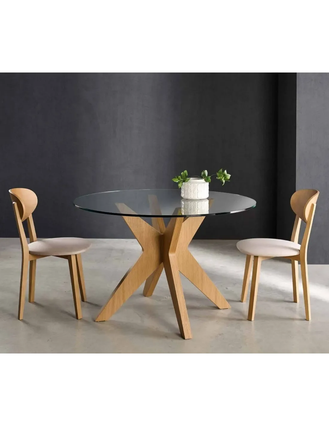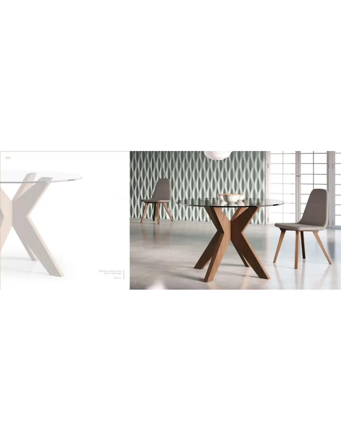 Pata disponible en madera de Haya, Roble y Nogal. Tapa de cristal de 12 mm. de espesor.