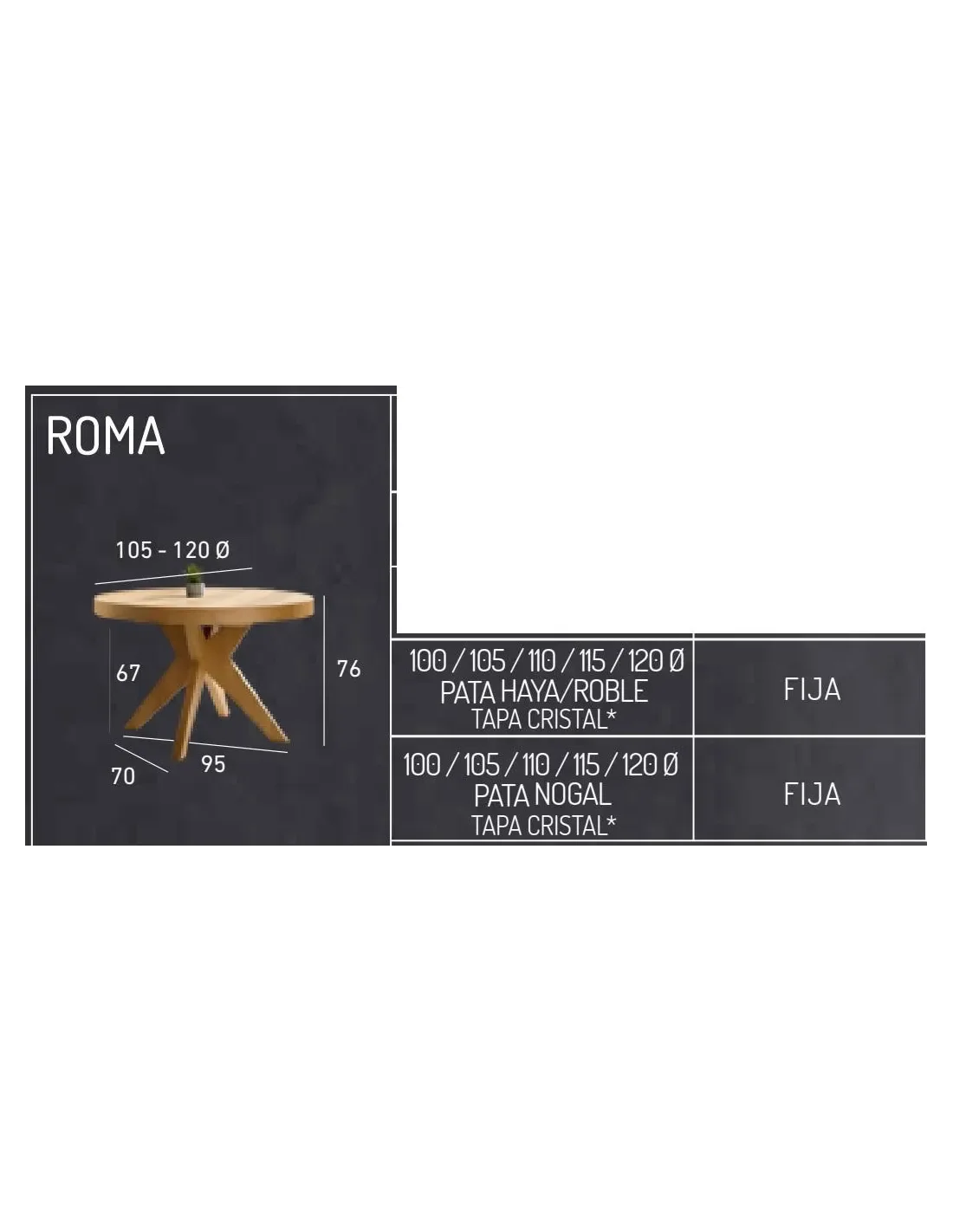 La mesa Roma viene disponibles en cinco medidas de diámetro: 100 / 105 / 110 / 115 / 120 cm. con una altura de 76 cm.