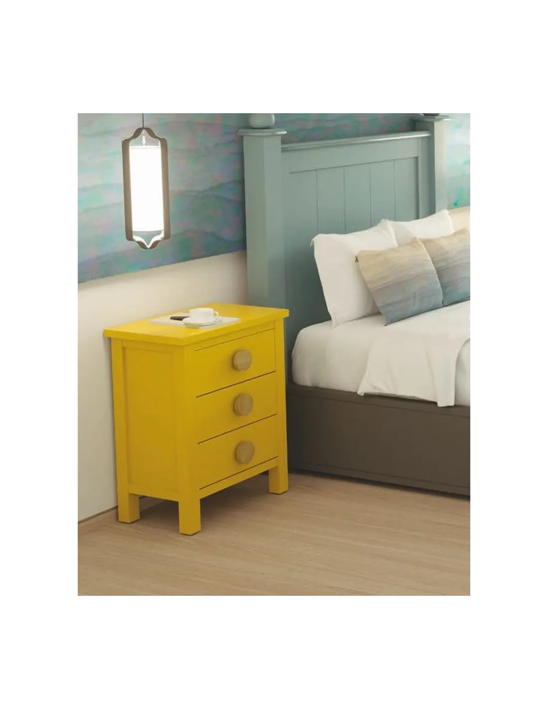 Mesita de noche colonial con tres cajones y patas fabricada en madera con dos medidas disponibles