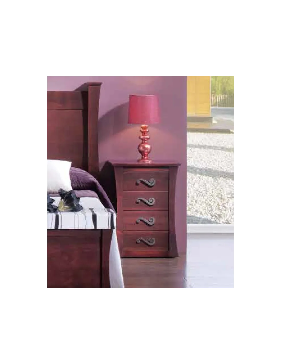 Esta mesita de noche cuatro cajones Viena está fabricado en Andalucía con materias primas de primera calidad. Madera de pino terminada en multitud de colores barnizados y lacados de primera acabados al detalle. Piezas singulares pintadas a mano.