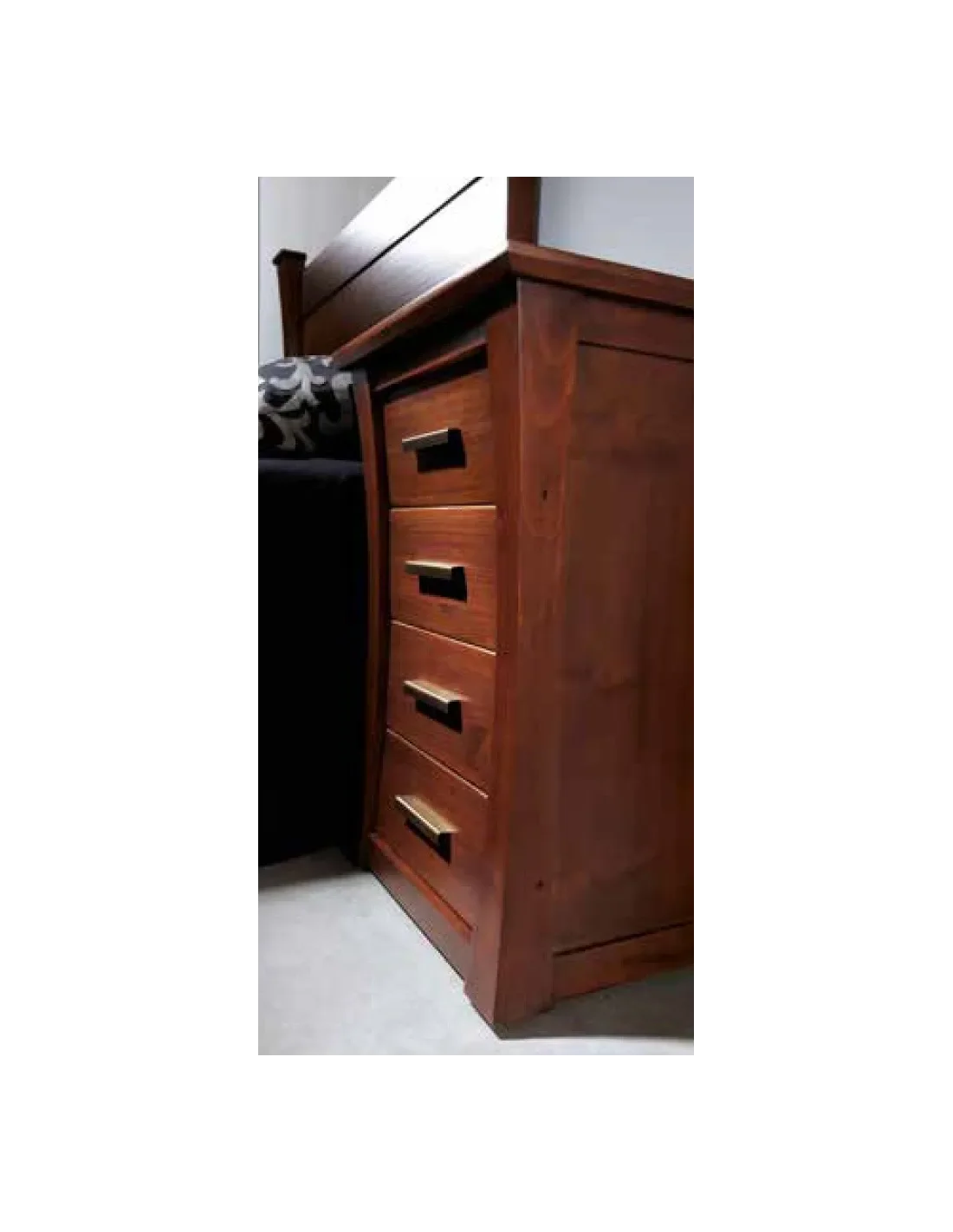 Mesita de noche con cuatro cajones de estilo neoclásico en madera. Muebles fabricados en acabados barnizados y lacados de primera.