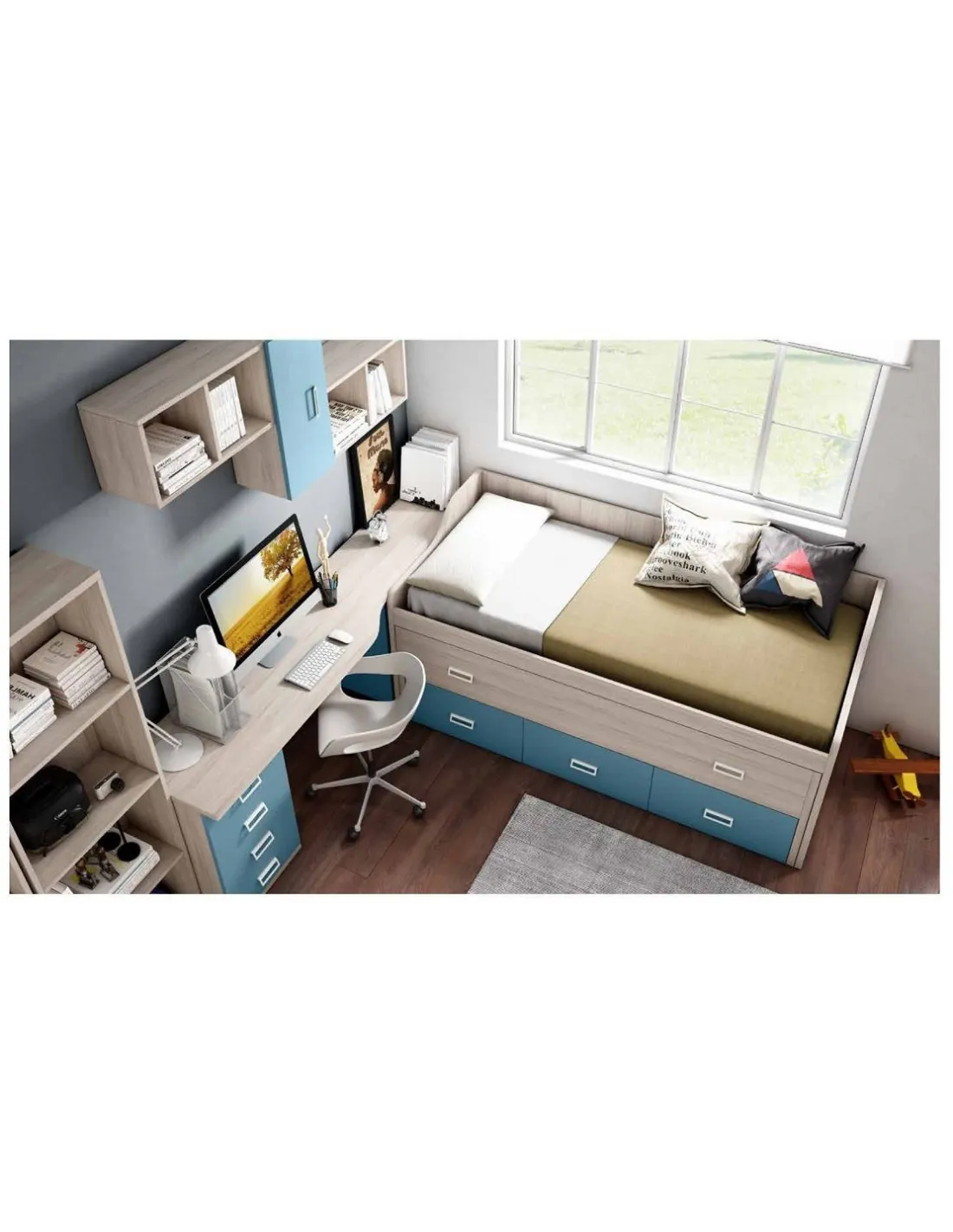 Este dormitorio juvenil con compacta viene preparada para dos camas, una de ellas de 90x190 y la nido de 90x180 cm. Incluye el módulo de armario con dos puertas y cajones, cama compacta con cajones inferiores de gran capacidad con guías metálicas de apertura suave, el escritorio con bajo zapatero y cajonera de cuatro cajones, las estanterías de suelo y los cubos de pared. Tiene diez colores a elegir, con las siguientes medidas totales: