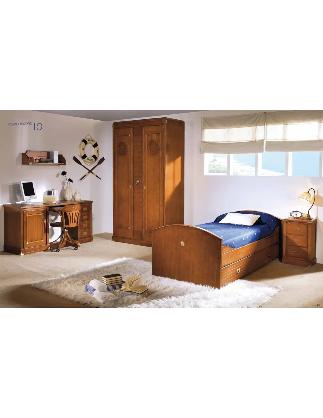 Este juvenil de diseño naútico tiene unos acabados pulimentados y barnizados de primera calidad, con la posibilidad de elegir entre blanco decapado, nogal claro y nogal naútico, con los detalles del mueble y herrajes de latón pulido.