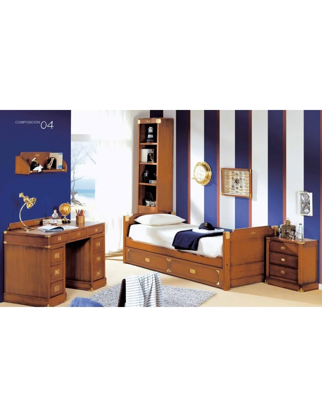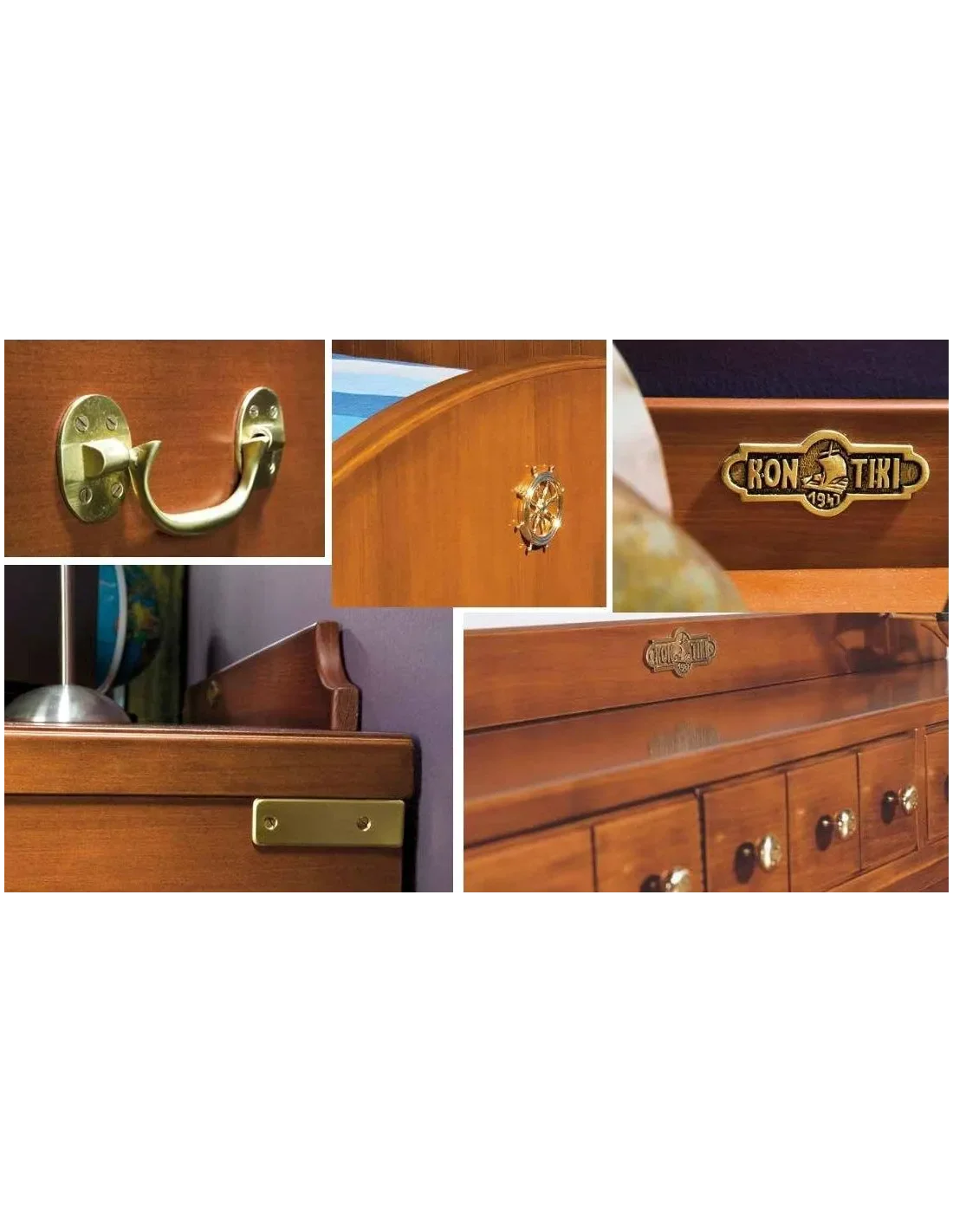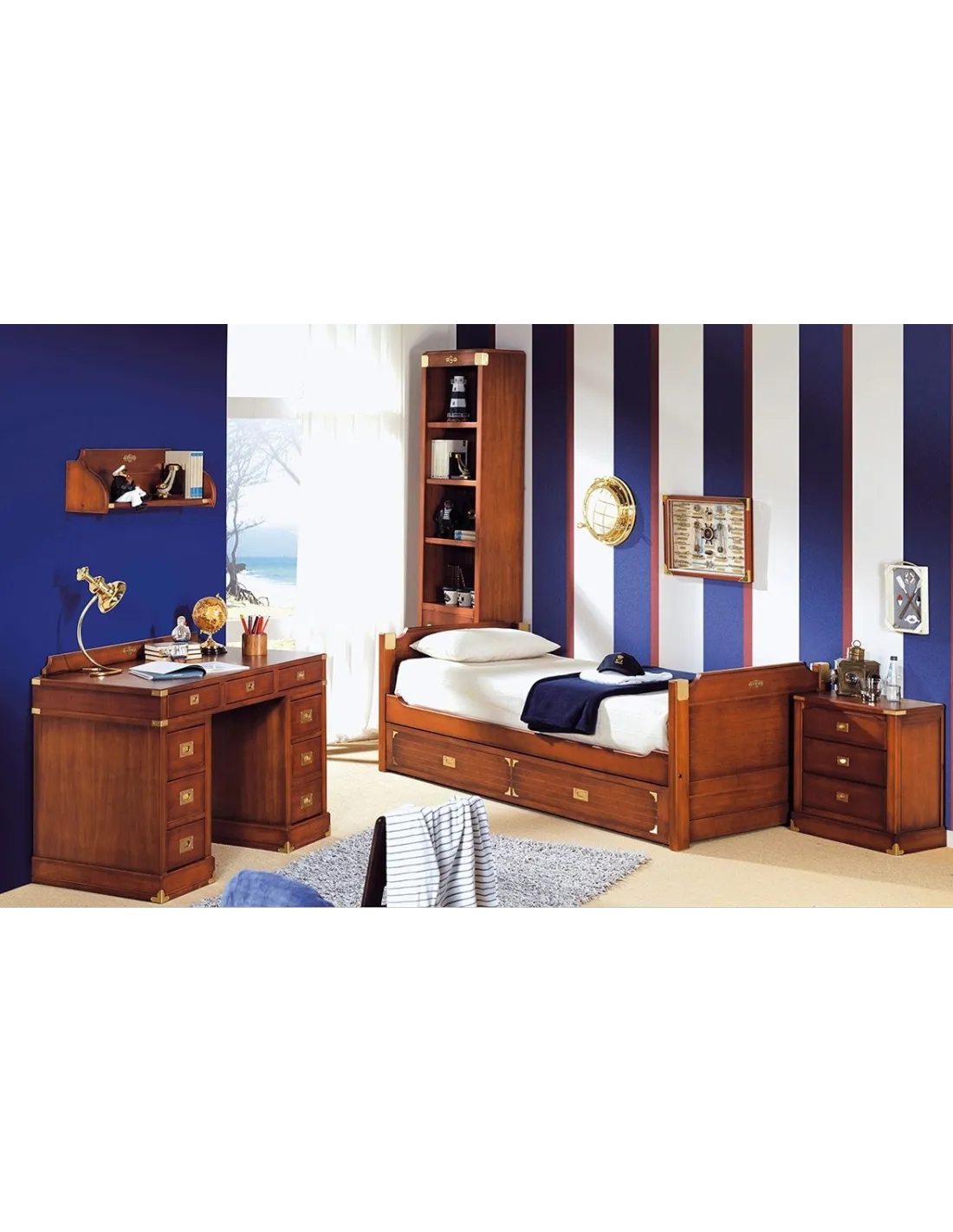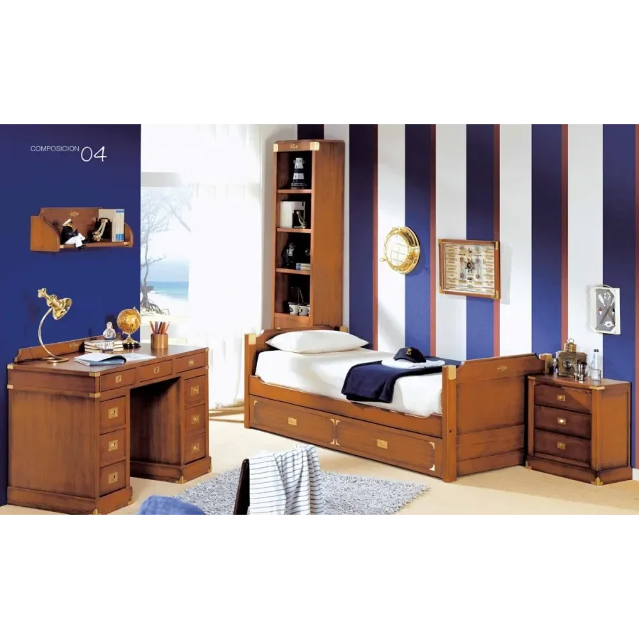 Este juvenil vintage Nautic tiene unos acabados pulimentados y barnizados de primera calidad, con la posibilidad de elegir entre blanco decapado, nogal claro y nogal naútico, con los detalles del mueble y herrajes de latón pulido.