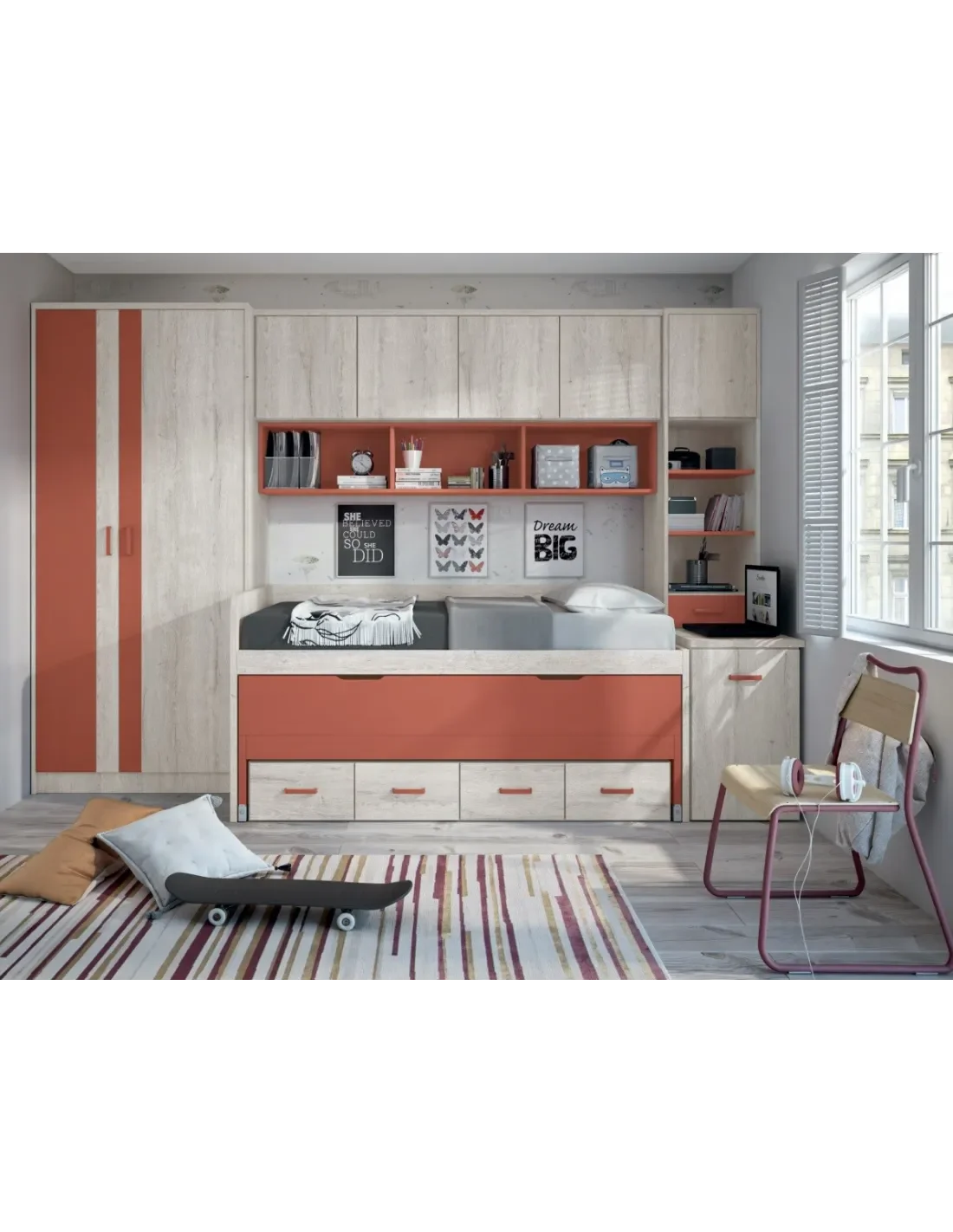 Composición juvenil con 360 cm. de largo. Cama compacta con dos camas de 90x190