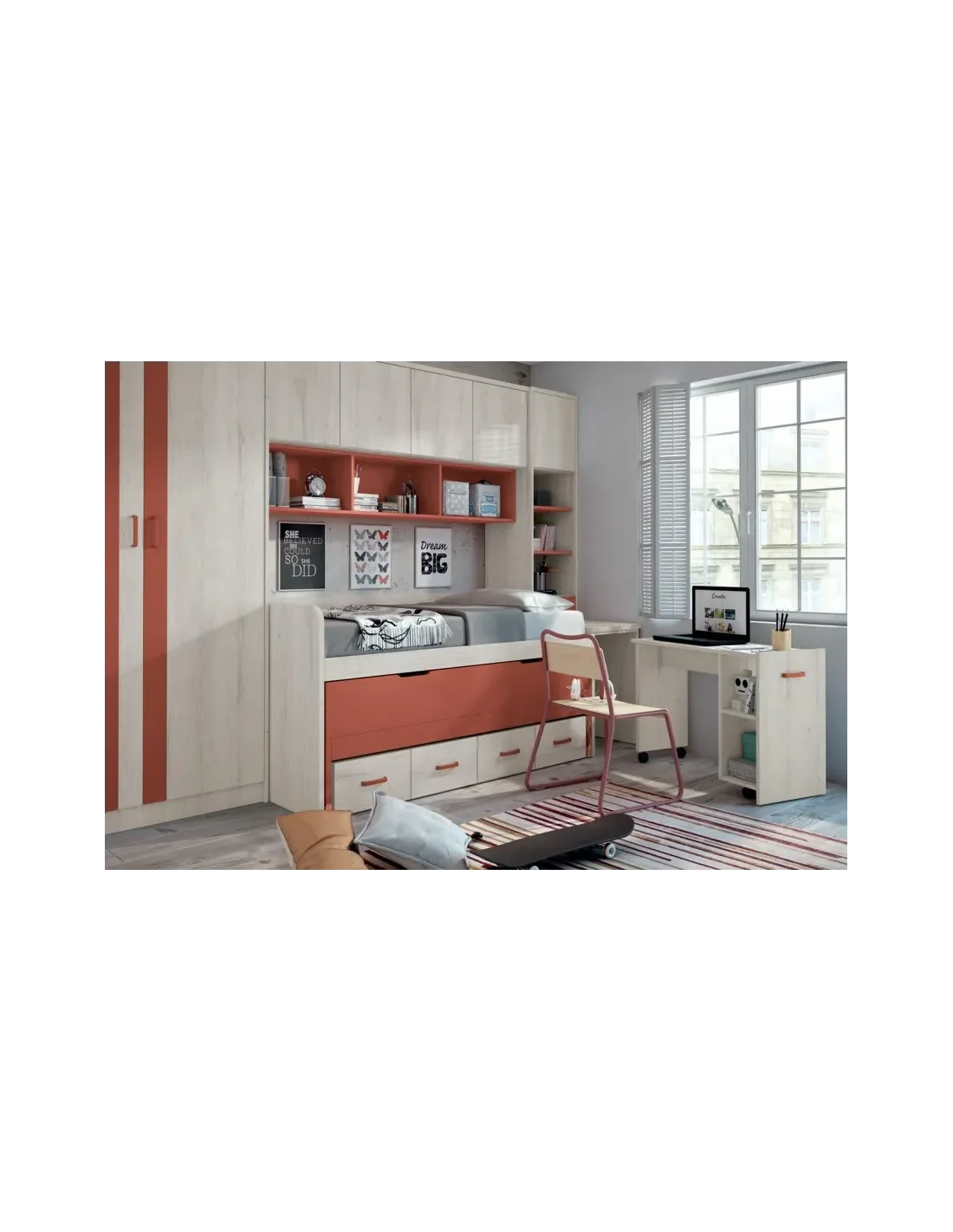 Composición juvenil de fabricación española hecha en melamina de primera calidad con tablero melamínico de primera calidad resistente a ralladuras y manchas, según normativa vigente. Tablero de 30 mm. de grosor canteado en PVC de 1 mm. de grosor y herrajes de primera calidad.