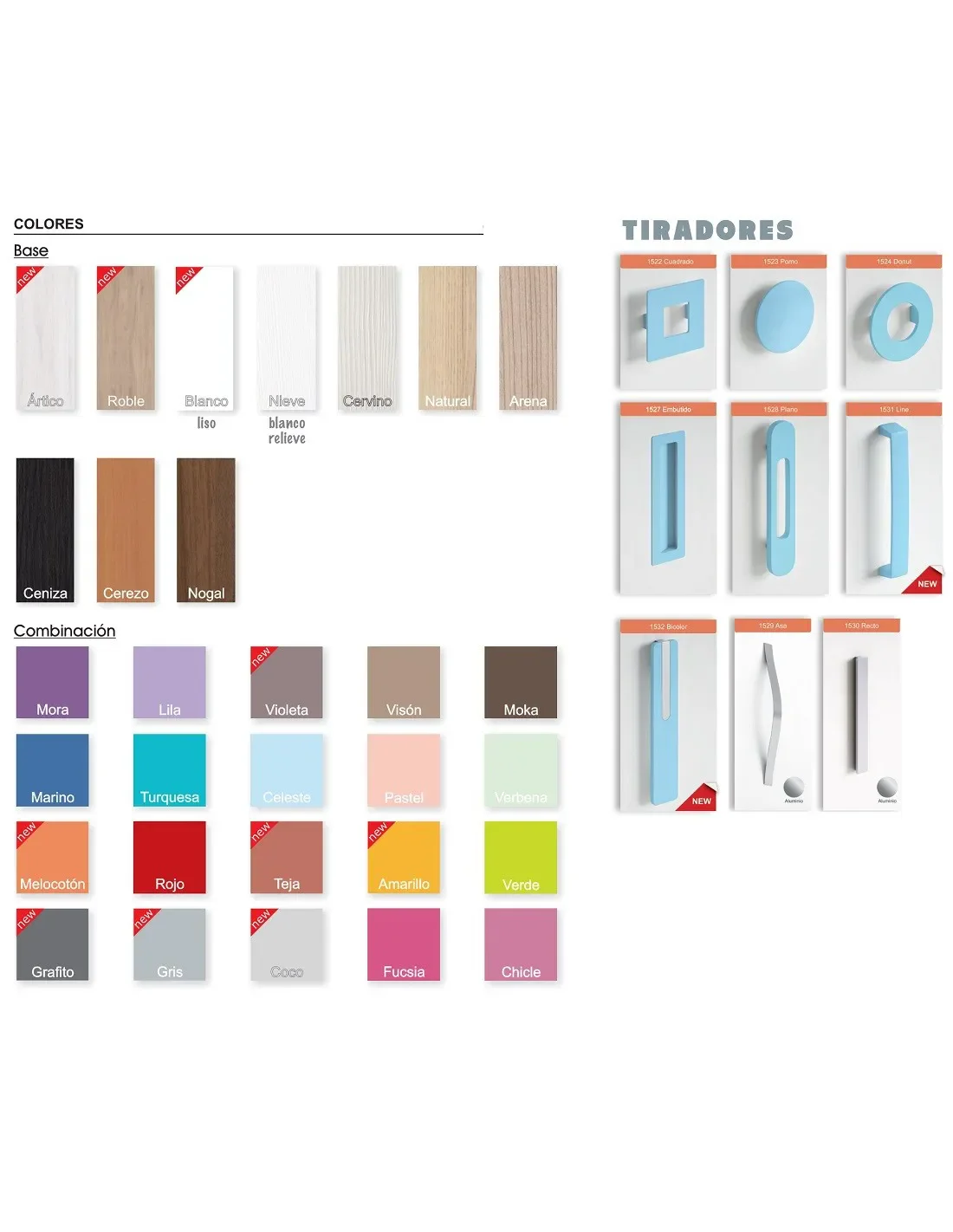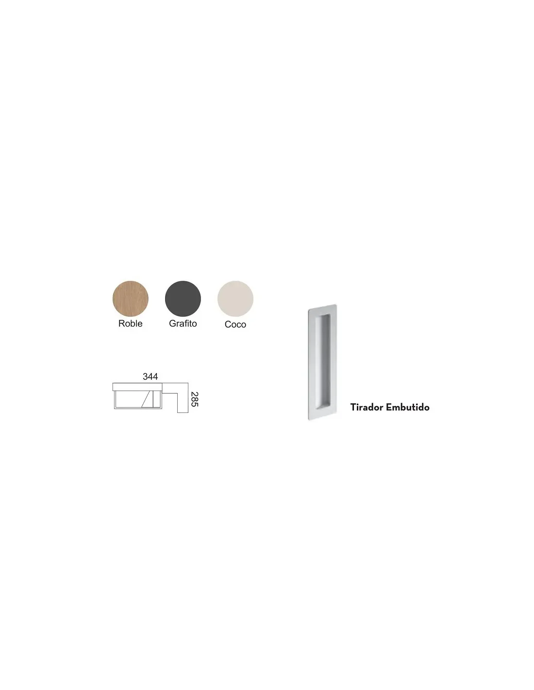 TIRADORES: por defecto se manda con el tirador modelo embutido que aparece en la foto principal. Puede cambiar el modelo y escoger cualquiera de los colores de combinación para ellos sin coste adicional.