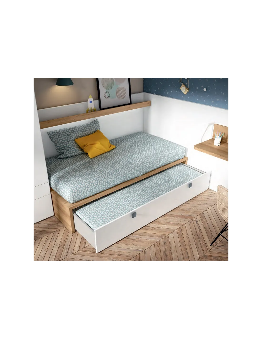 La cama nido viene preparada para ser usada como cama supletoria (para colchón de 90x190 cm.) o cajón para guardar.