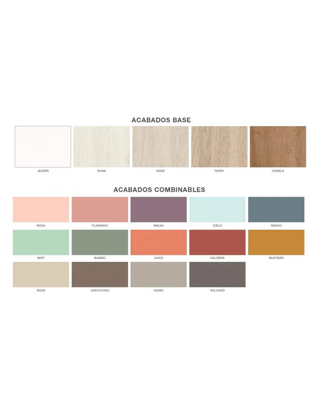 - COLOR BASE: que será el que se predomine en el mueble (obligatorio a usar en las partes que aparecen de blanco en los dibujos de medidas).