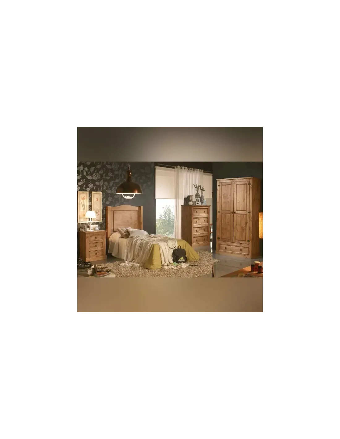 Este dormtorio colonial de madera tiene un diseño inspirado en los muebles de estilo rústico. Fabricado en madera maciza de pino con acabado a la cera. Combinada con herrajes y tiradores de forja negra.