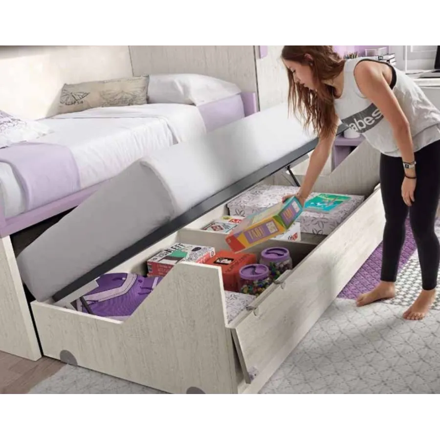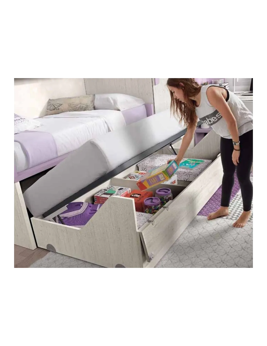 Dormtiorio juvenil con cama compacta con canapé y armario chaflán con terminal estantería. Incluye escritorio.