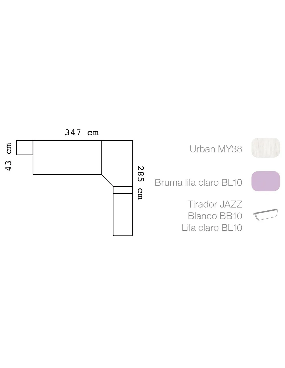 Este dormitorio incluye varios elementos que en conjunto tienen una medida total de 285x347 cm. Se compone de varios módulos que pueden colocarse de manera independiente o como en la foto. Consta de los siguientes muebles y medidas (en alto x largo x fondo cm.):