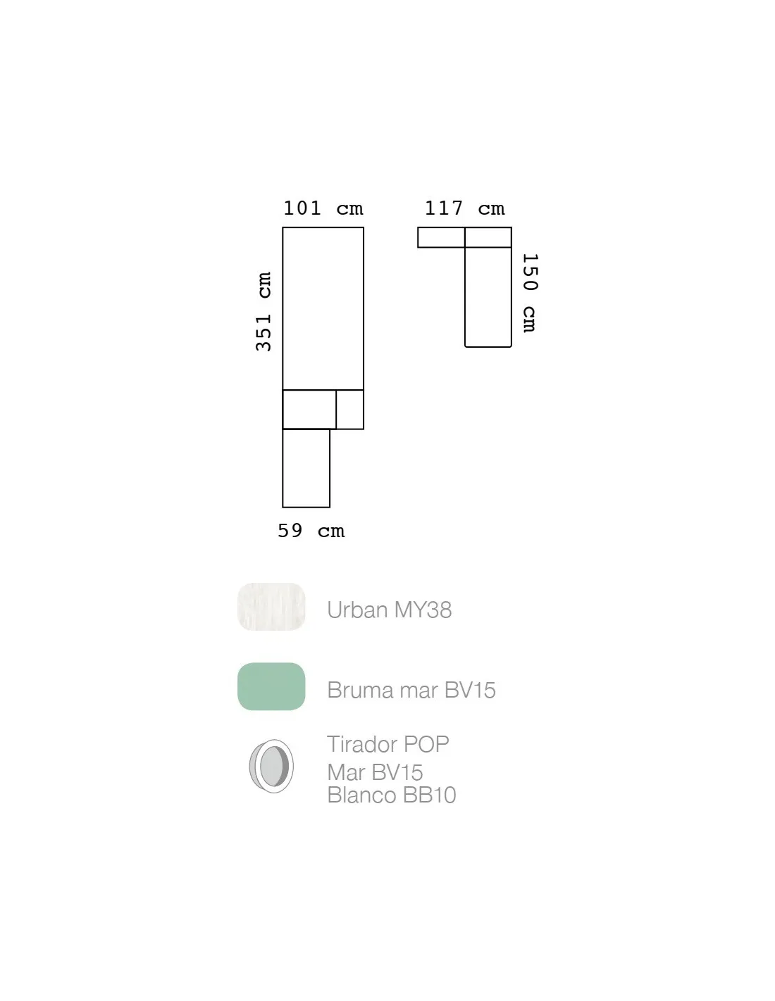 Este dormitorio incluye varios elementos que en conjunto tienen una medida total de 351 x (101+117) cm. Se compone de varios módulos que pueden colocarse de manera independiente o como en la foto. Consta de los siguientes muebles y medidas (en alto x largo x fondo cm.):