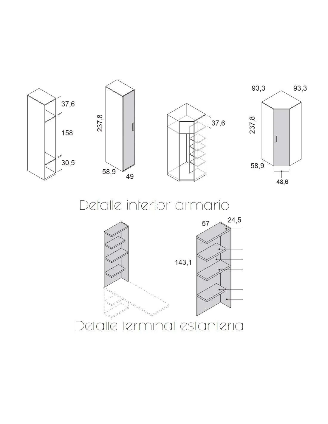 - Armario rincón chaflán con estantería terminal: compuesto por un módulos de una puerta, un módulo chaflán y el de estantería. 238 x 142 x 118