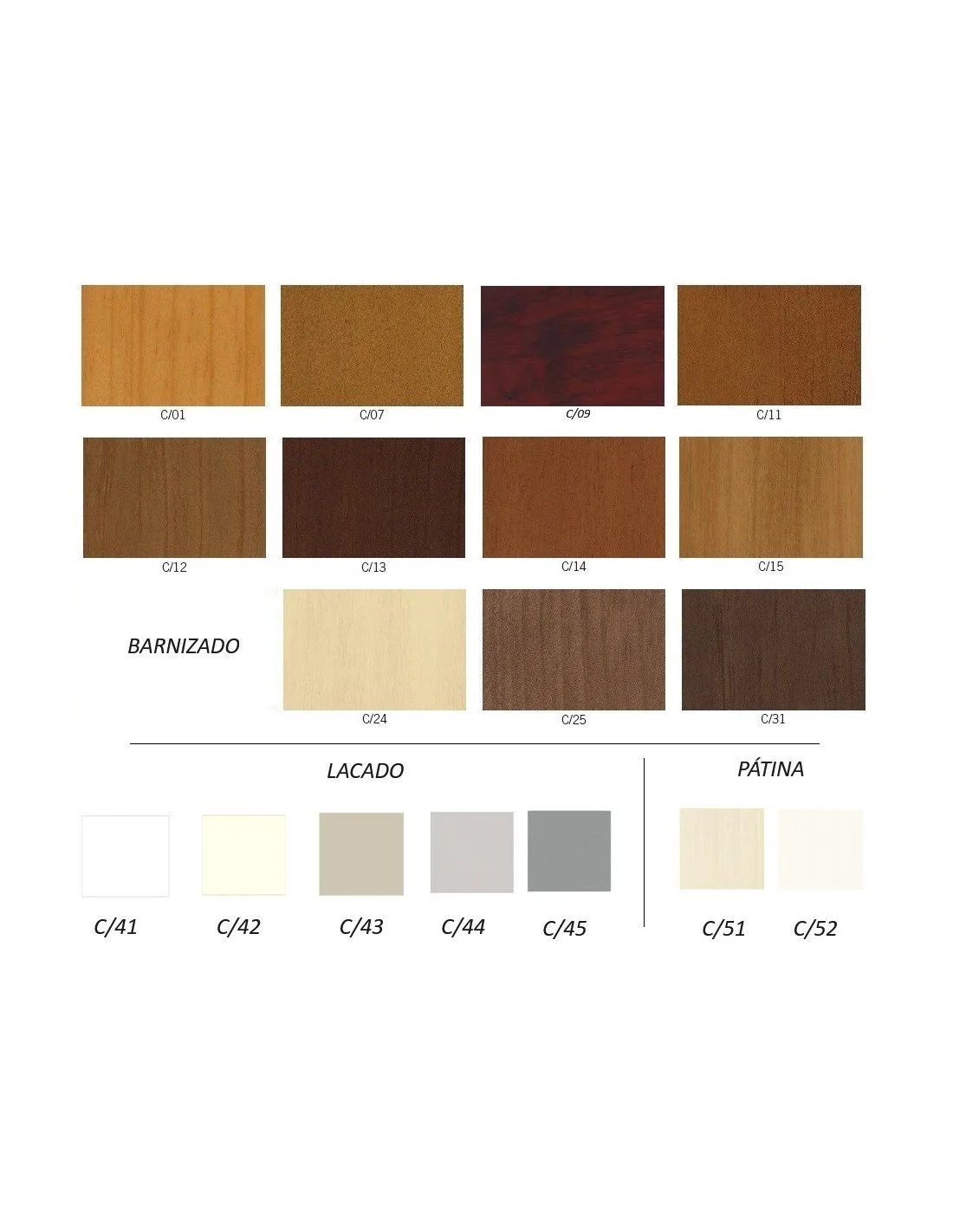 Tenemos la posibilidad de acabar nuestros muebles en colores lacados y barnizados bajo color muestra, con un incremento de precio (consultar con tienda). Esto nos da la posibilidad de combinar nuestro nuevo mueble con otros que ya tengamos en casa. Podemos lacar nuestros muebles de madera en tonos como el blanco roto o el beige, y podemos barnizarlos con deferentes tonos de nogal, miel, roble, cerezo, avellana etc.