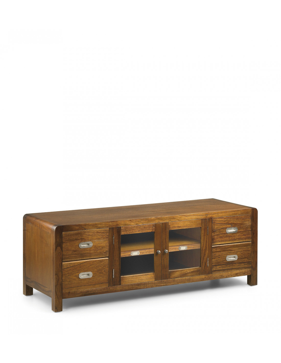 Tv fabricado en madera maciza de Mindi con inconfundible diseño colonial con cajones y puertas.