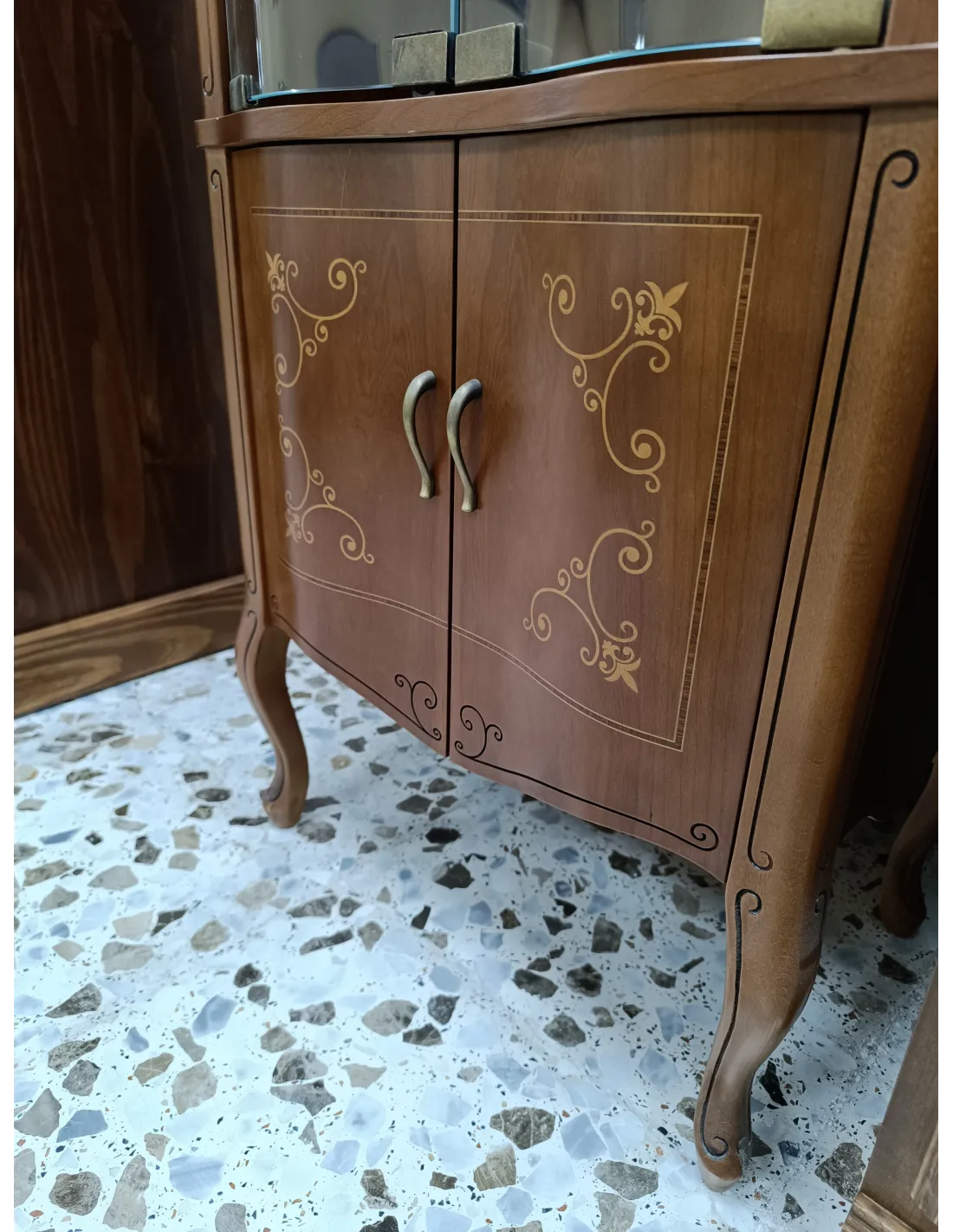 Vitrina artesanal fabricada en madera de haya y cerezo, con detalles de marquetería, cristales con forma, patas esculpidas y acabados de lujo.