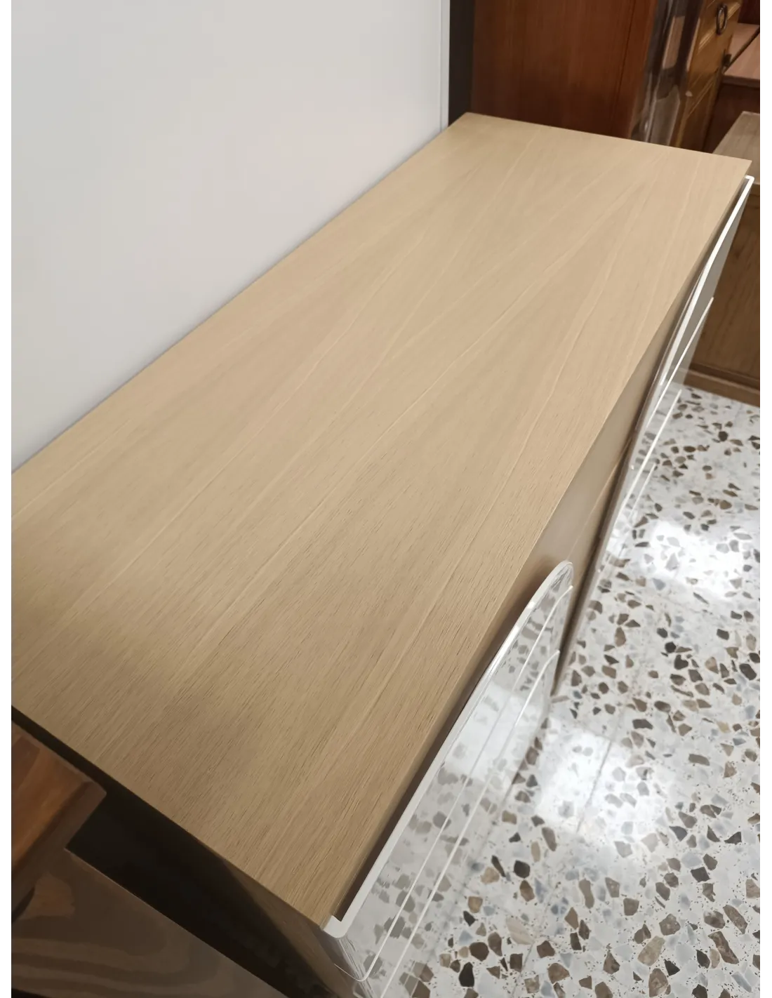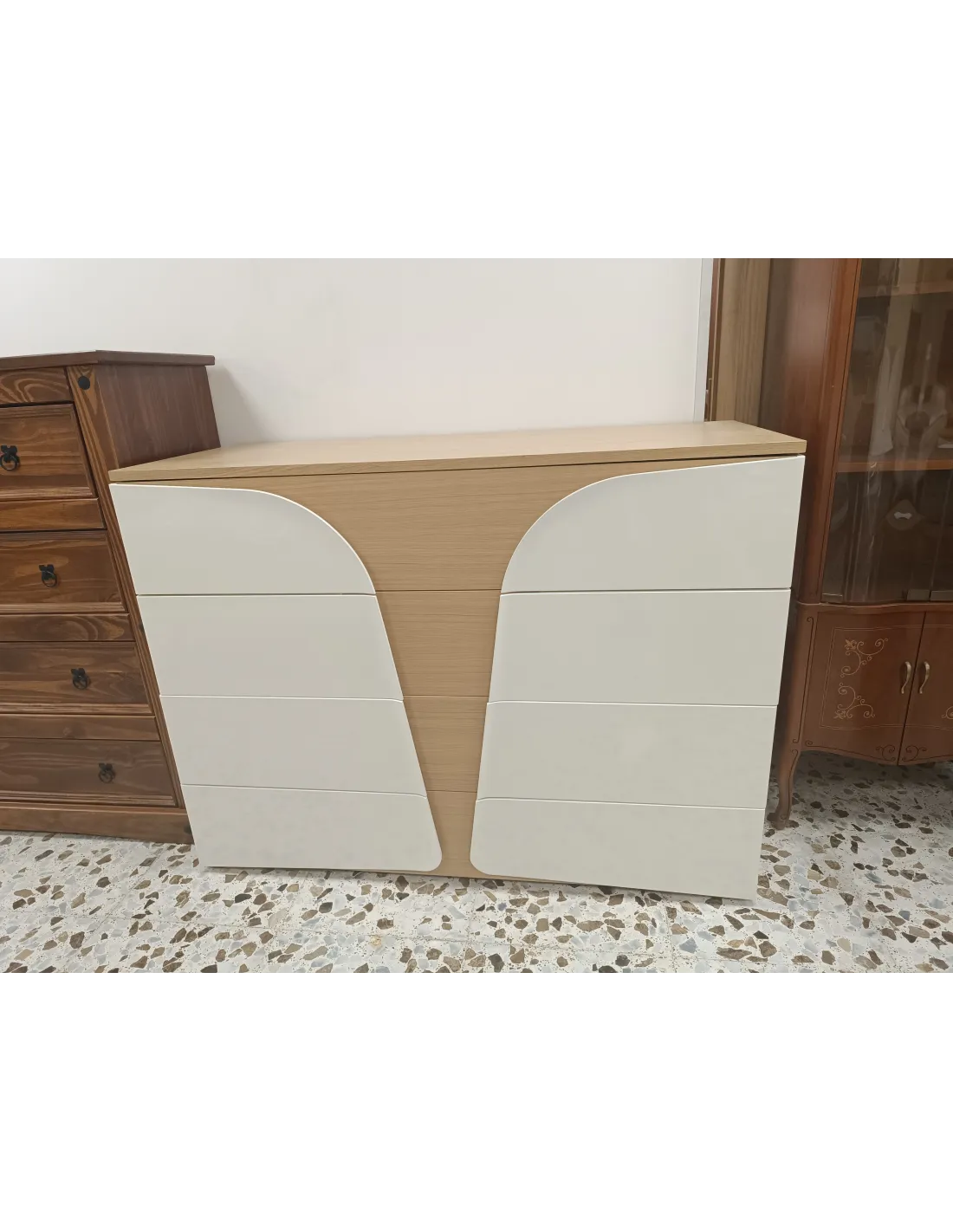La colección de dormitorios Sueños combina materiales nobel como la madera con acabados de diseño moderno. En este caso la composición viene acabada en roble natural con blanco brillo.
