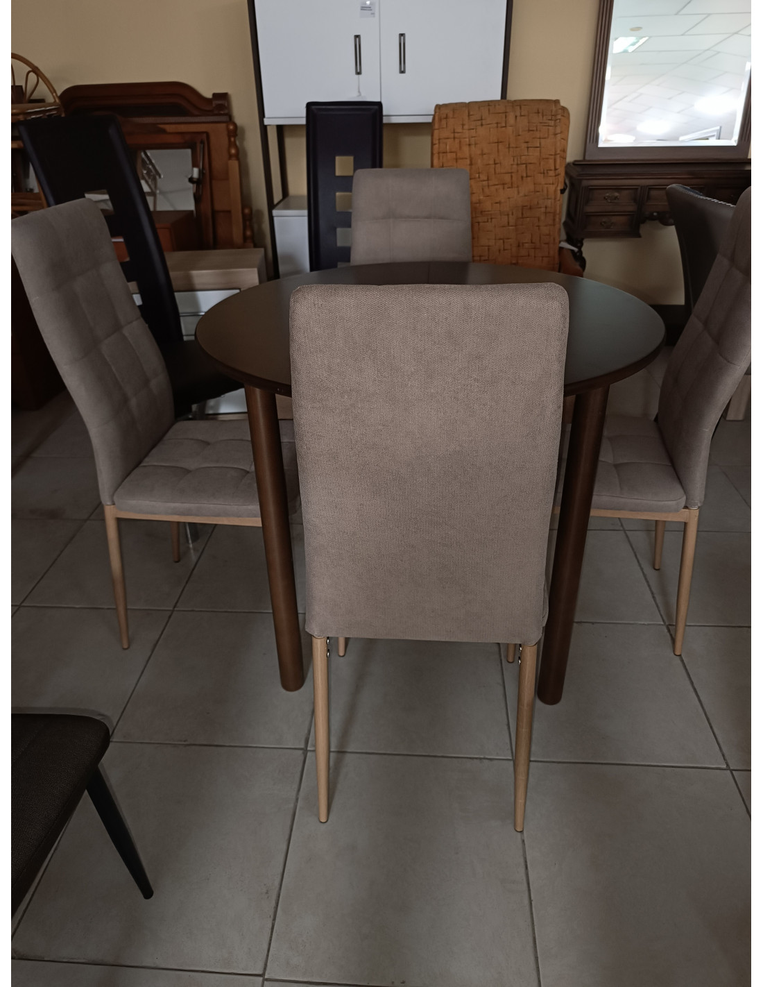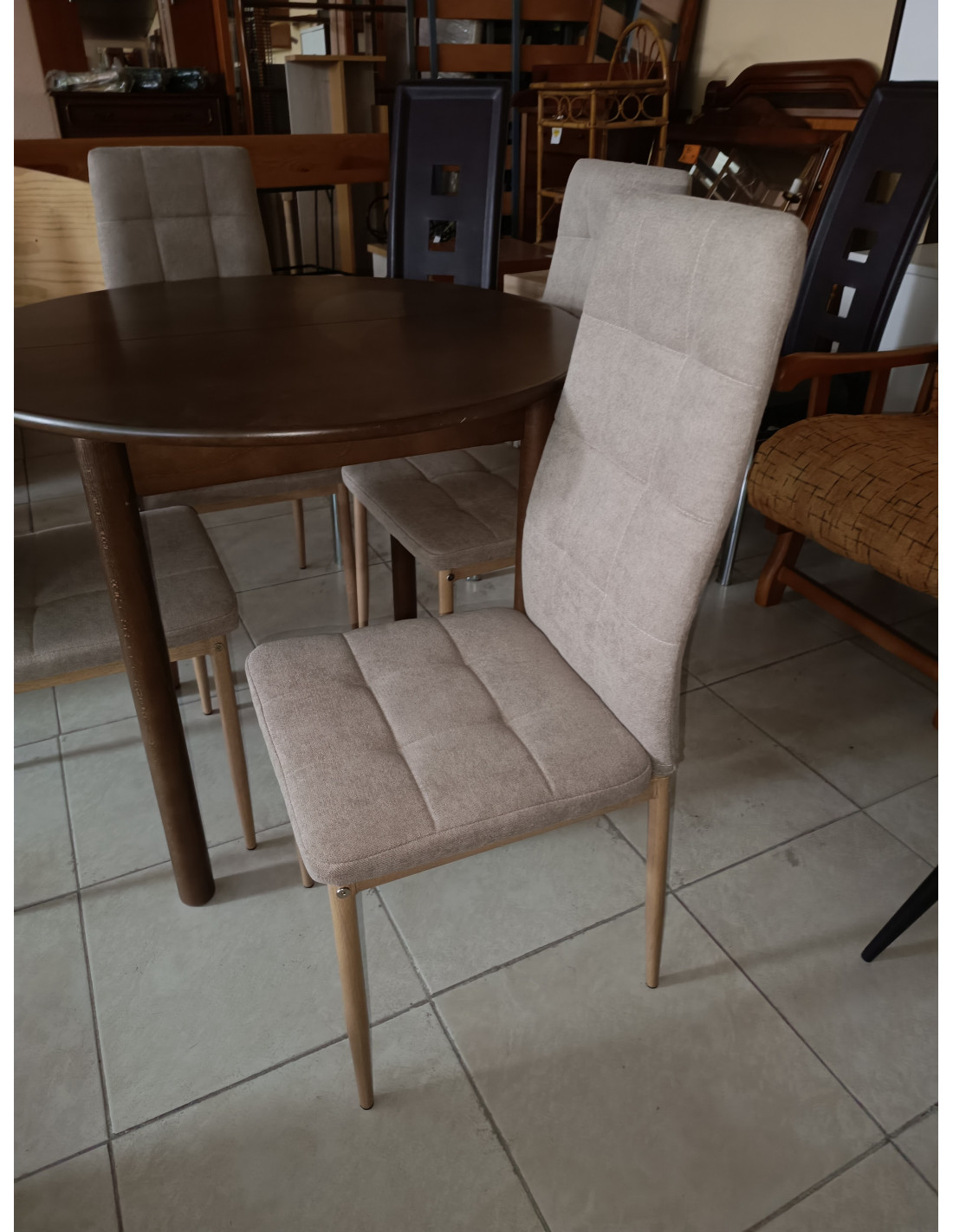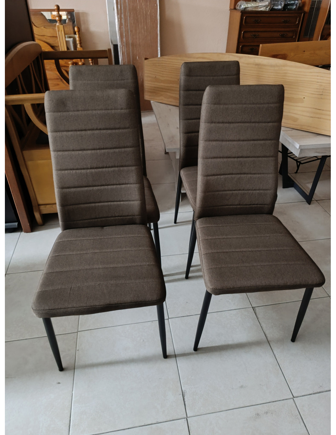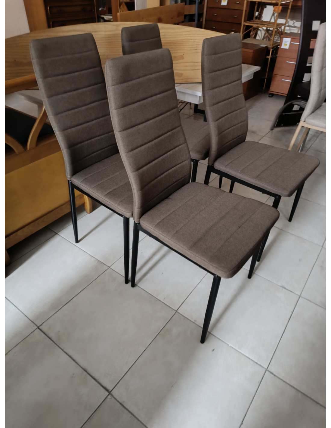Conjunto de 4 sillas tapizadas en tono chocolate con patas negras o beige con patas imitación madera.
