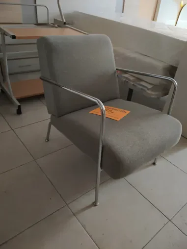 Sillón de diseño moderno tapizado gris con estructura cromada.