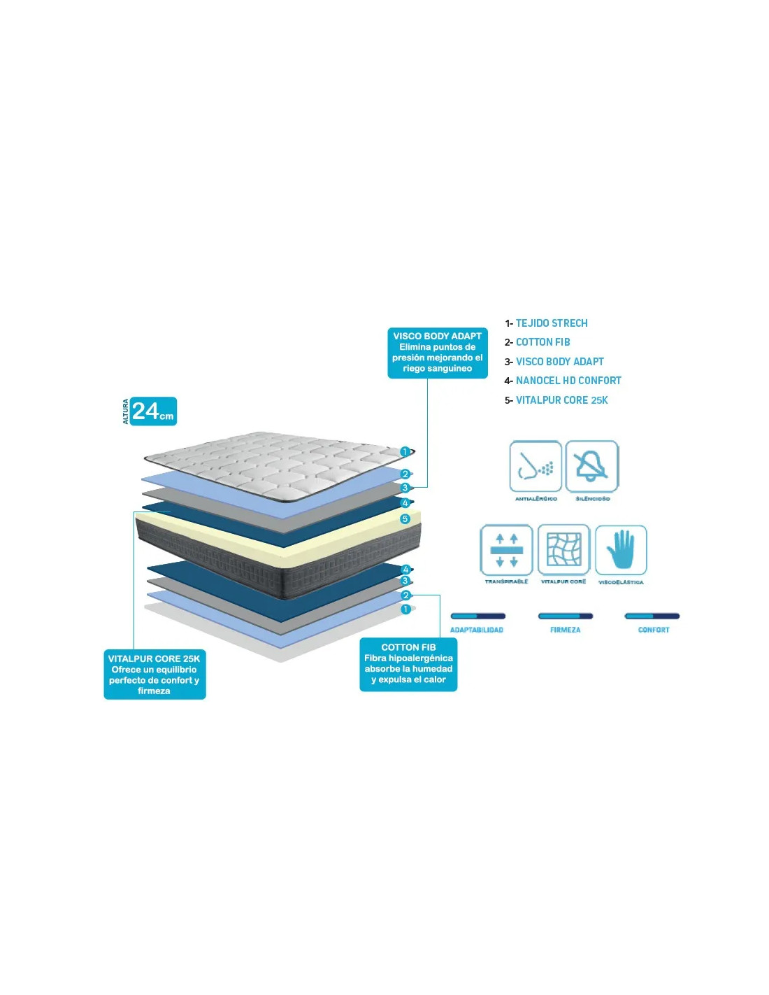 Colchón sin muelles viscoelástico de alto total 24 cm. Es un colchón terminado igual a ambas caras, con las siguientes capas: