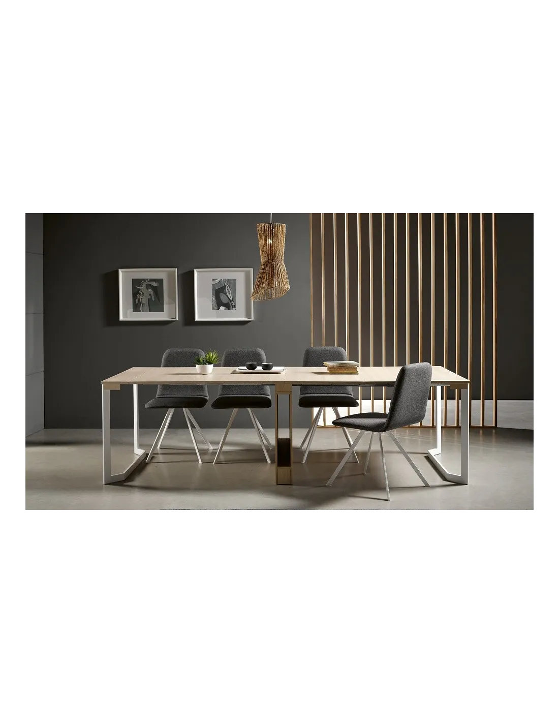 La mesa doble extensible Lika Madera combina su diseño moderno con la posibilidad de aplicar diversas terminaciones, viene disponible en medida única con cuatro mecanismos extensibles, de apertura independiente y apoyados sobre guía telescópica de primera calidad.