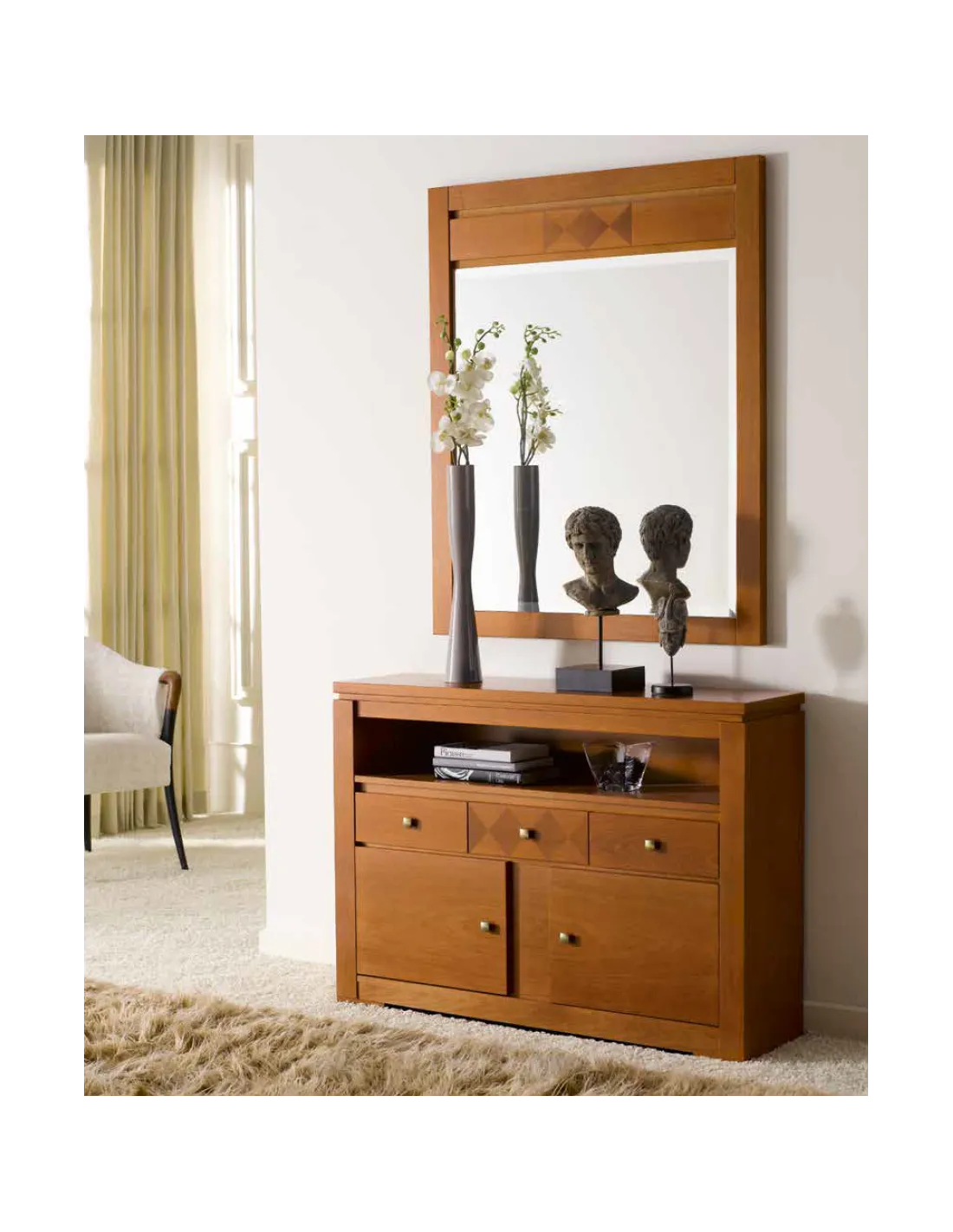 Este mueble taquillon 110 con frente rayado viene con dos puertas, con detalles hechos a mano en madera de cerezo, tres cajones con el central rayado y el hueco superior diáfano. El espejo que lo acompaña es opcional.