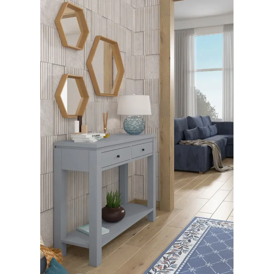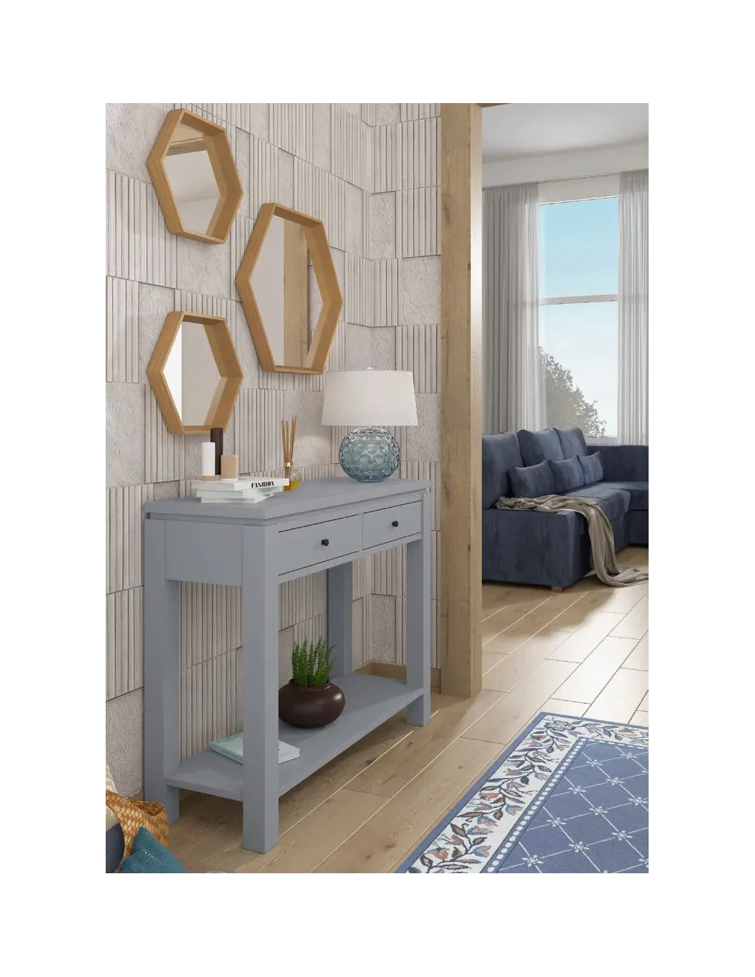 Este modelo de recibidor abierto colonial con patas puede venir en varias terminaciones lacadas y barnizadas a su elección: