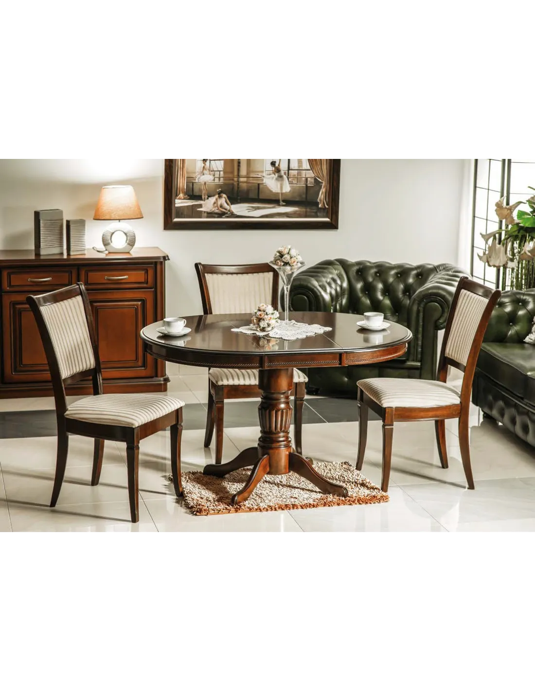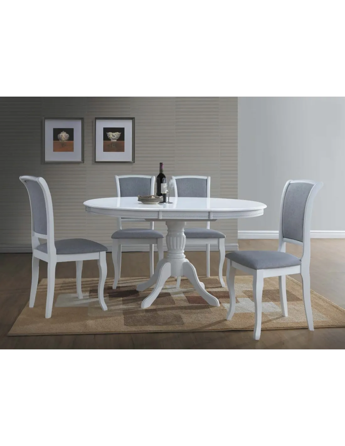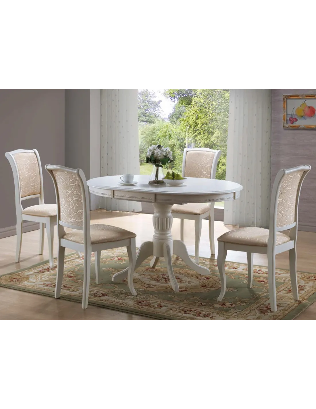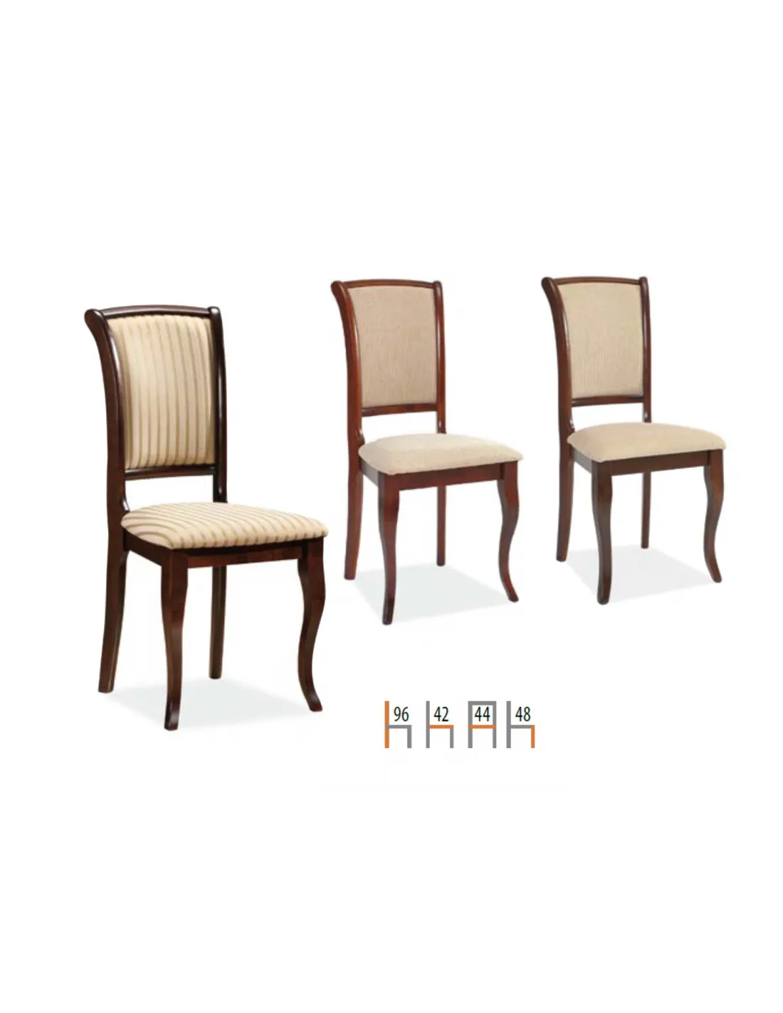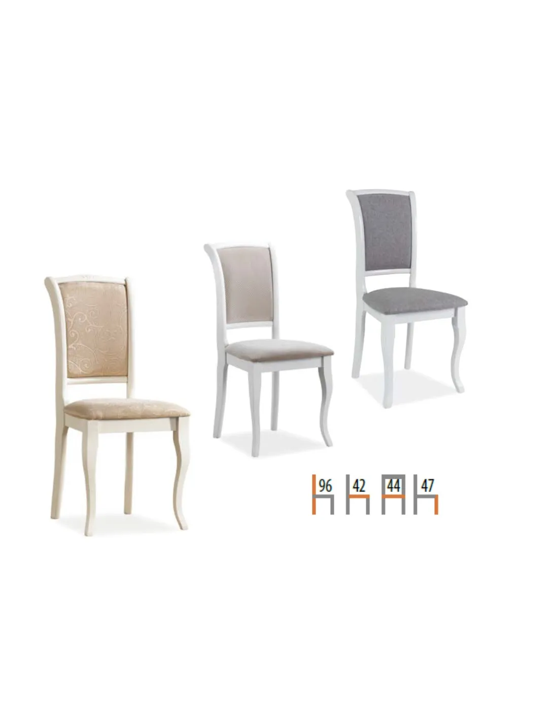 Estas sillas pueden venir en tres acabados disponibles para la madera: nogal oscuro, blanco o blanco roto, así como en varios tapizados lisos o tipo Jaquard a elegir.