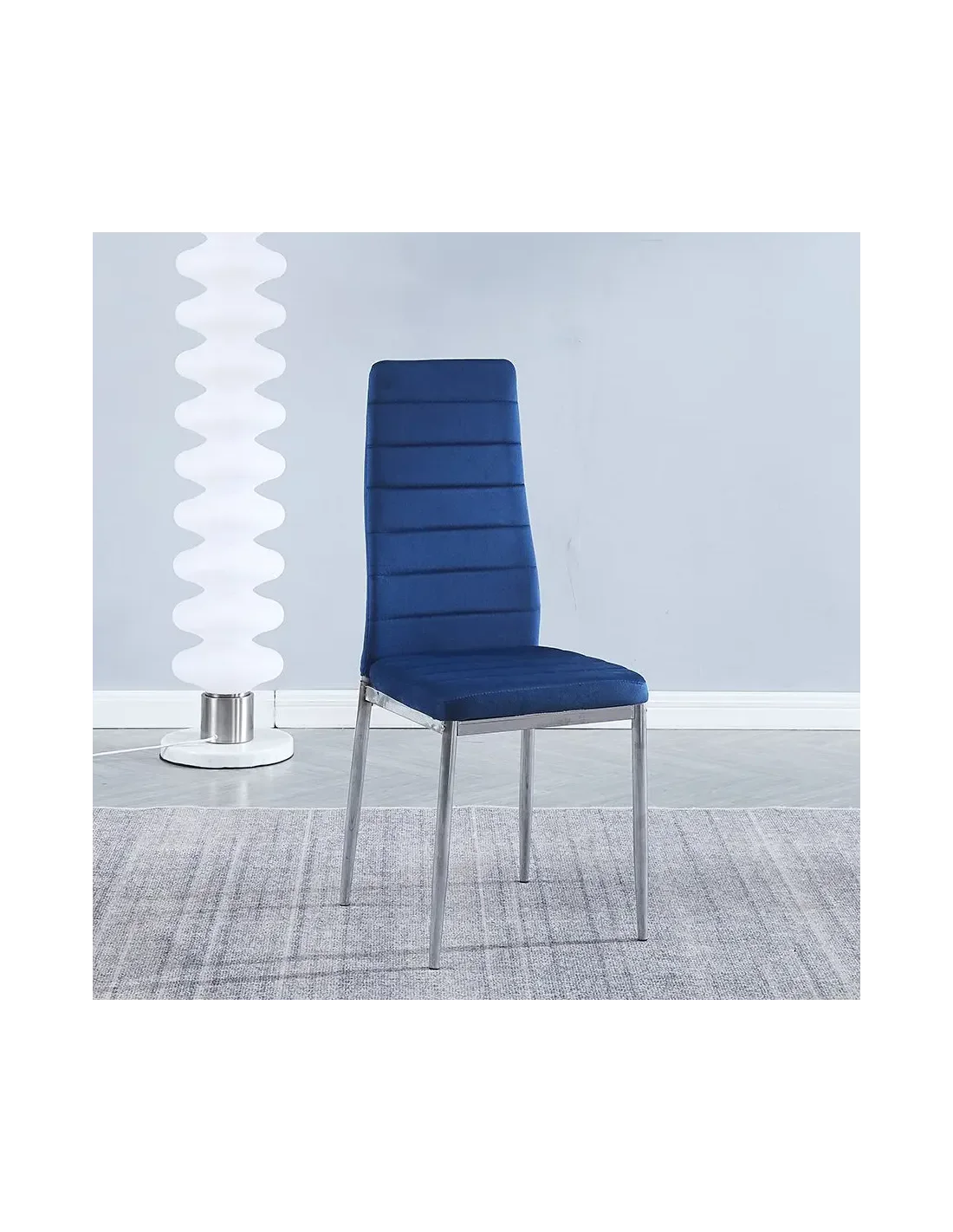 Esta silla tapizada es de formato kit (se entrega desmontada, no incluye montaje). Cuenta con estructura metálica con patas cromadas y tapizadas en tono azul.