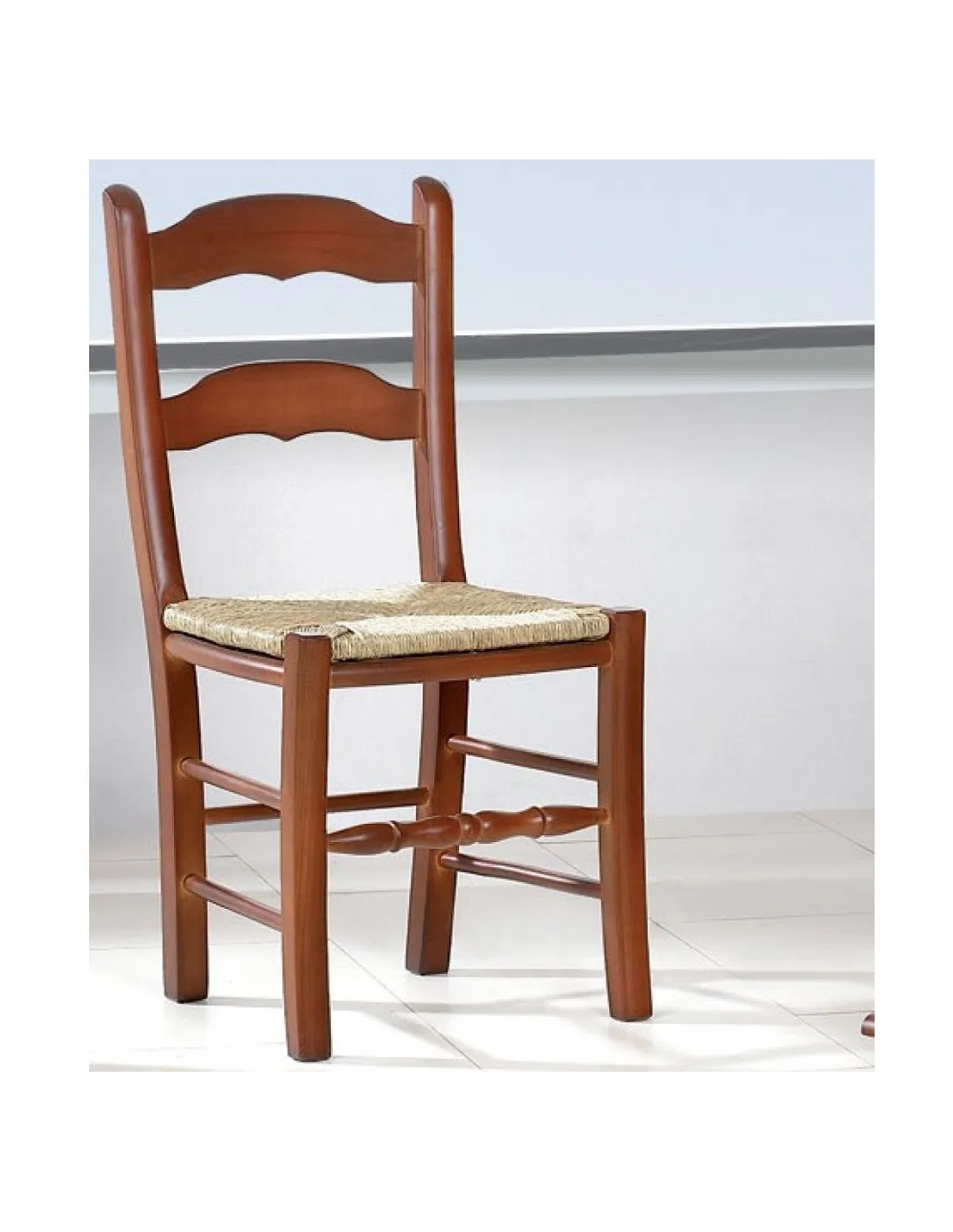 Esta silla tapizada de diseño rústico es resistente a la vez que confortable gracias a su estructura de madera natural de haya. El asiento, a la par de mullido, es especialmente acogedor.