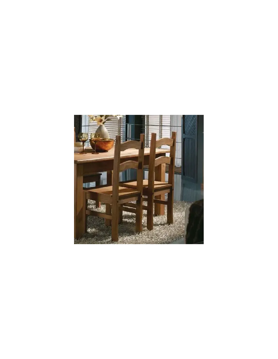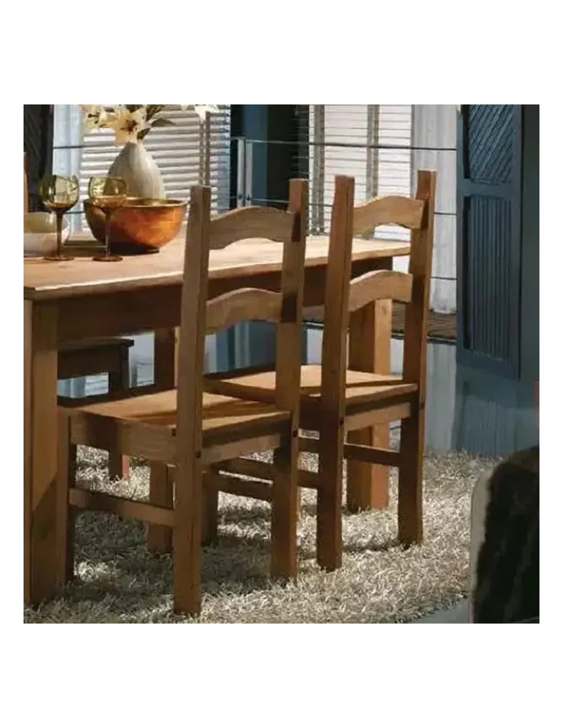 Esta silla de madera tiene un diseño inspirado en los muebles de estilo rústico colonial. Fabricada en madera maciza de pino con acabado a la cera. Combinada con herrajes y tiradores de forja negra.