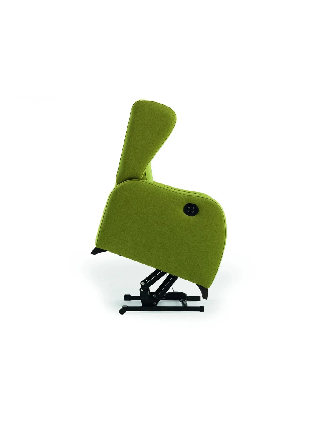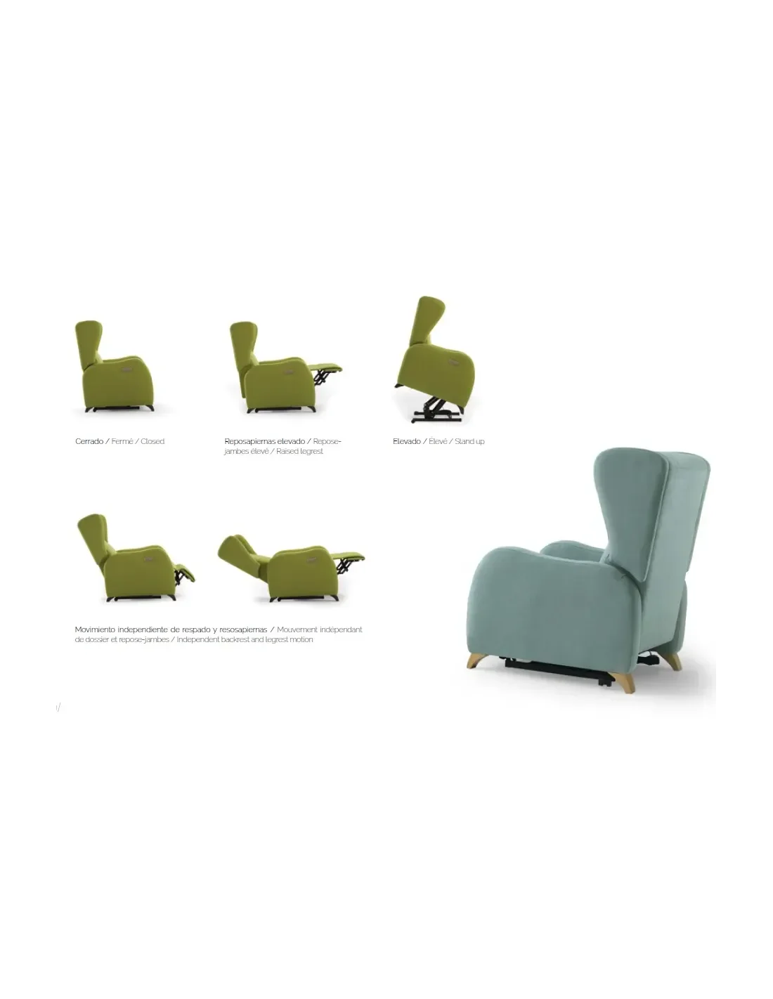 Este sillón combina la estructura de madera y tablero forrado con espuma, dobles costuras remalladas con un tapizado con tratamiento antimanchas y el mecanismo a motor con función levanta personas con elevador.