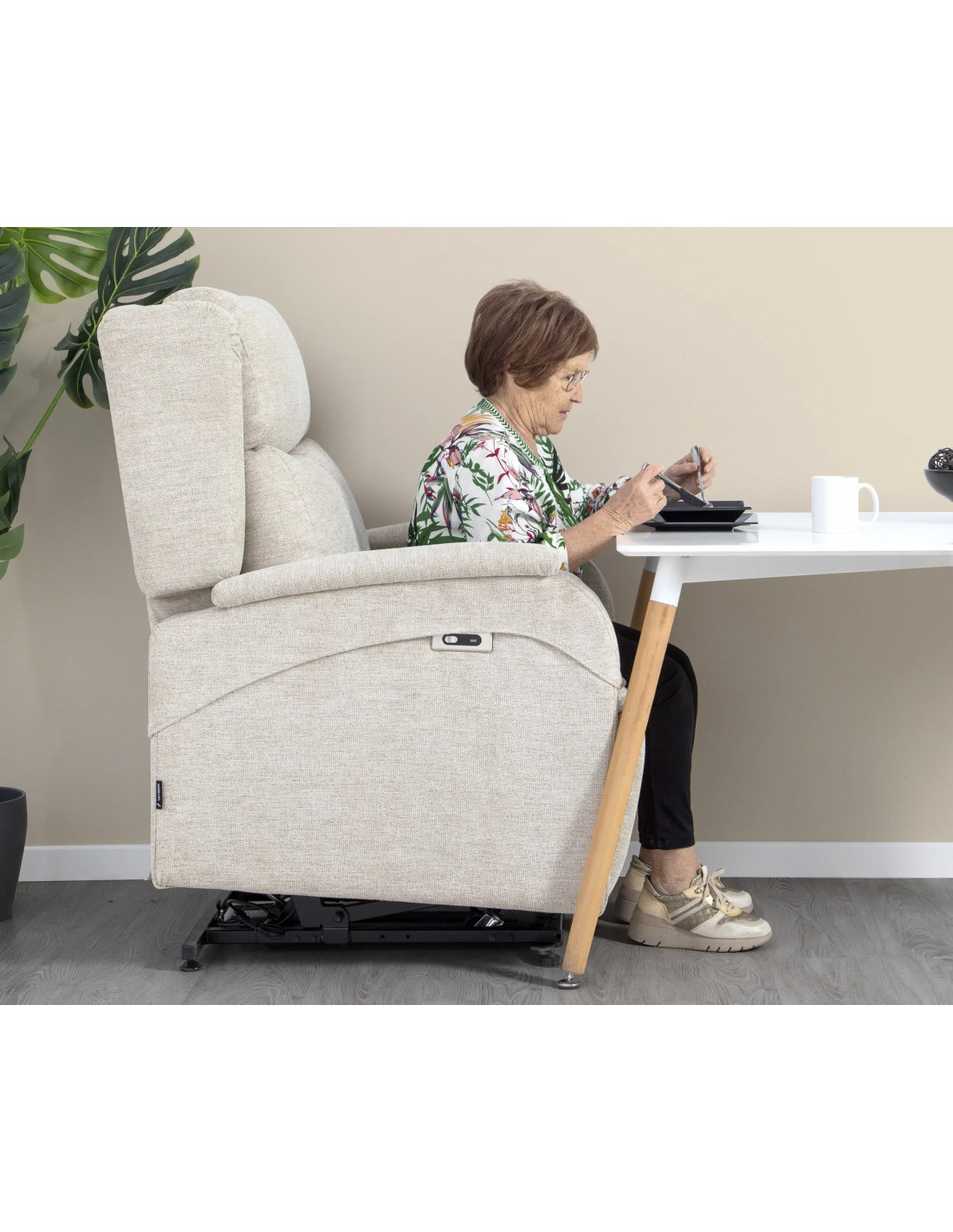 - Mecanismo de elevación vertical y power lift accionado mediante motor. El mecanismo elevador power lift comienza su apertura con una elevación vertical de 12 cm. A continuación entra en acción el mecanismo power lift para ayudar a levantarse la persona por si sola.