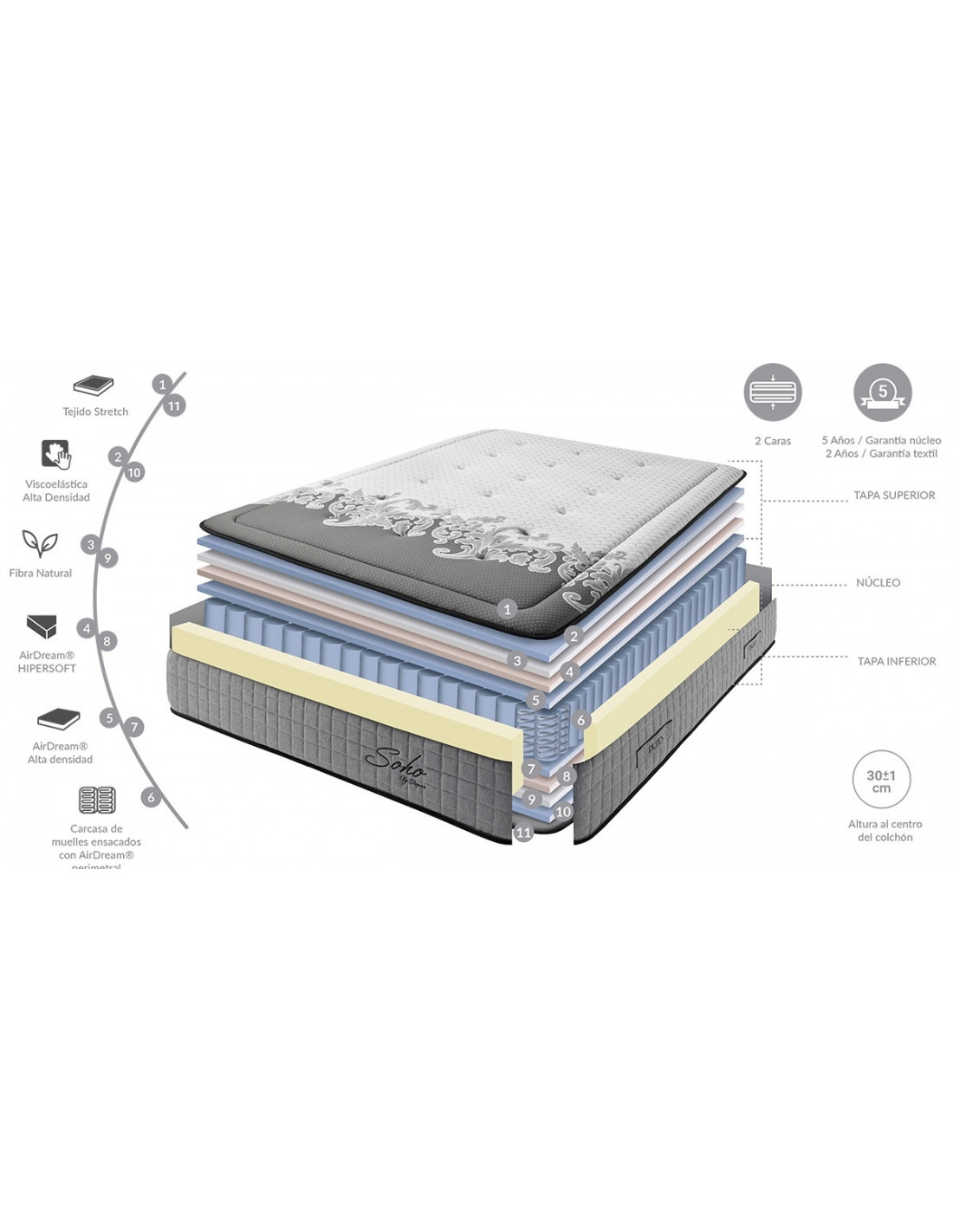 Multiplica las fantásticas características propias del sistema ensacado, aumentando el confort y la adaptabilidad, proporcionando un confort insuperable en el colchón Soho de Dupen, viscoelástico y tapizado en tejido strech de máxima calidad. Combina fibras naturales y Airdream en sus acolchados interiores, para mejorar la aireación, y la viscoelástica en las zonas de confort.