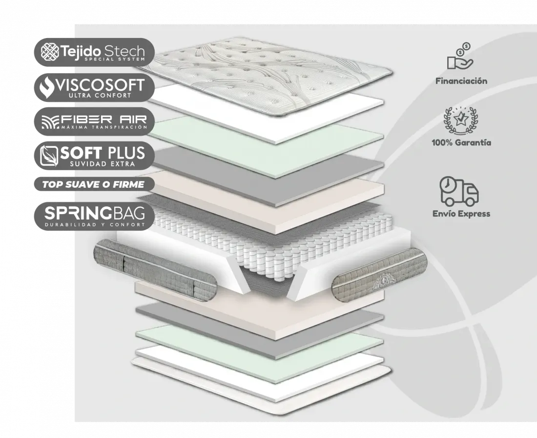 Este modelo cuenta la combinación perfecta entre muelles ensacados y viscoelástica, aportando una mayor comodidad y adaptación gracias a su sistema de TOPPER interior que se adapta a todas las necesidades favoreciendo un descanso adecuado para nuestro cuerpo.