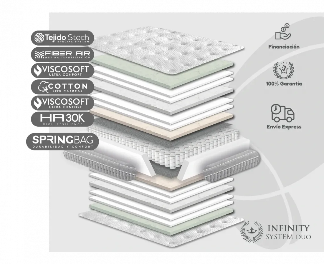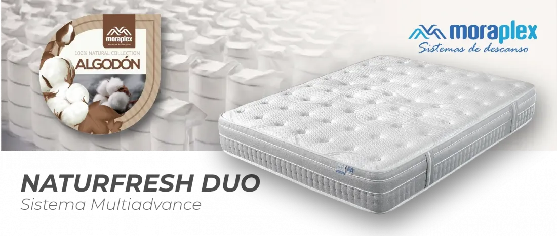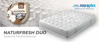 El modelo Naturfresh Duo (Itaka), posee la combinación perfecta entre muelles ensacados y viscoelástica aportando una mayor comodidad y adaptación favoreciendo el descanso. Gracias a su capa de algodón mejora la transpiración entre capas. A demás puede elegirse en dos firmezas SOFT y FIRM, adaptandose así a cualquier tipo de cuerpo.