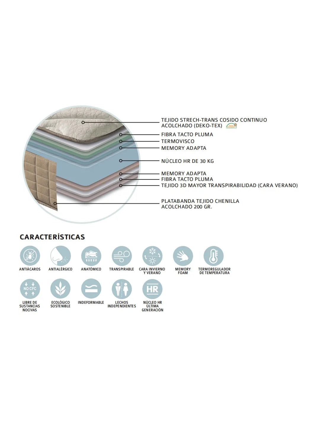 El colchón modelo Génova es un colchón que destaca por su firmeza a la par que gracias a su tejido 4D y su termo visco, conseguimos un colchón fresco en verano, mullido y acogedor en invierno, manteniendo un perfecto alineamiento de la columna vertebral y la independencia de lechos para un mejor descanso.