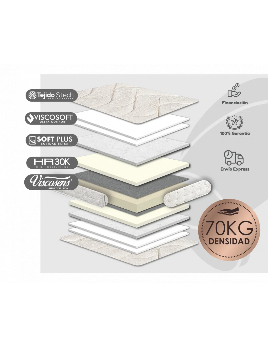Este modelo destaca por su exclusivo núcleo ViscoSens D70, que combina HR y Visco. Su densidad lo hacen un colchón de firmeza intermedia y muy duradero; permitiendo una adaptación gradual según el peso y la temperatura de las personas que descansan en él. Su núcleo compactado de HR D70 combinado con viscoelástica consiguen un soporte firme ideal para personas que están en edad de crecimiento, deportistas o personas de elevado peso ya que su composición consigue un núcleo de soporte firme que se adapte a nuestro cuerpo en función del peso y del calor acumulado.