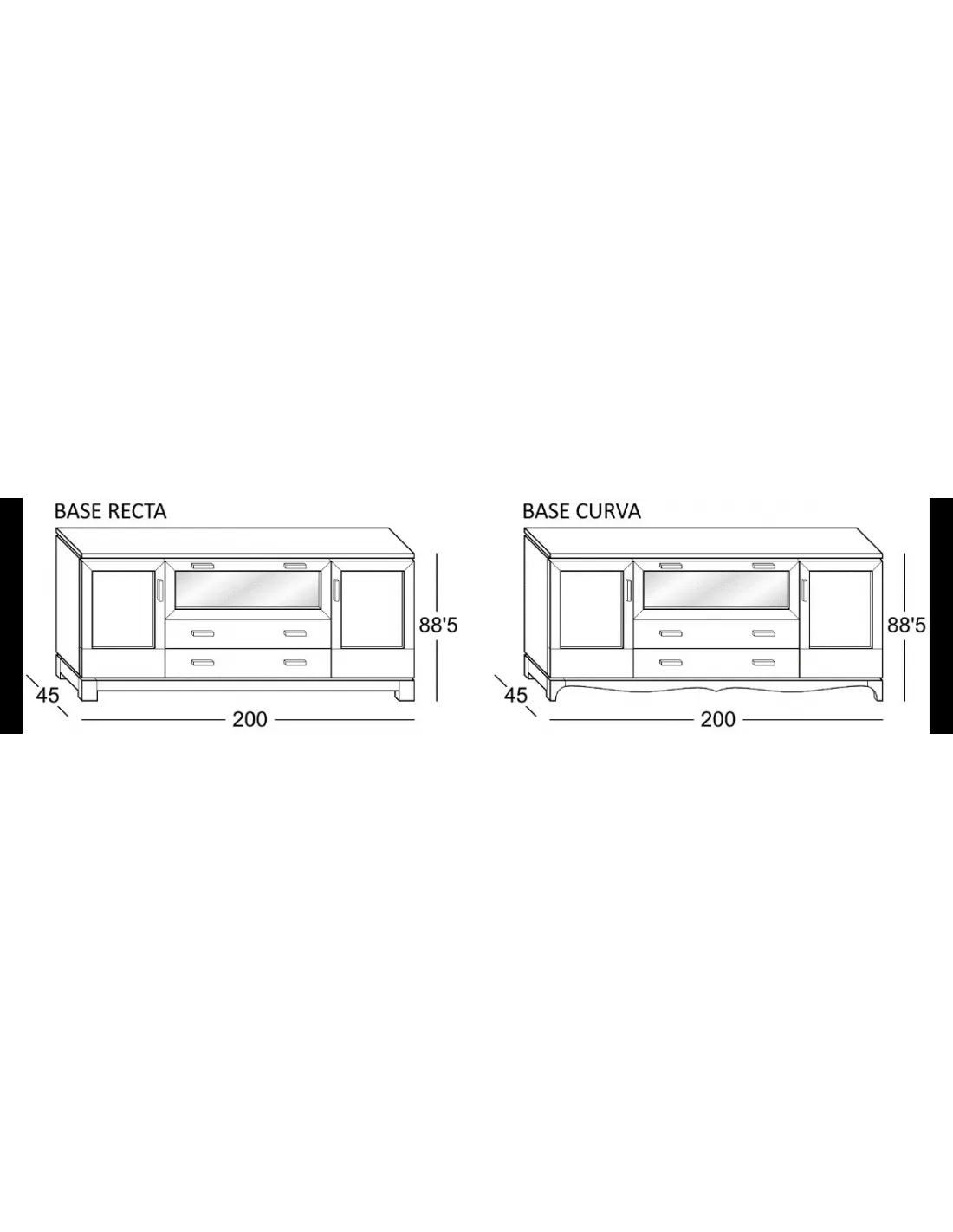 Este aparador 200 cm. de diseño neoclásico se puede personalizar primero en su apariencia, pudiendo optar por una base de apoyo a suelo con acabado curvo o recto , lo cual nos da toques de diferencia en el mueble. Además, podrá elegir entre cinco modelos de tirador al mismo precio