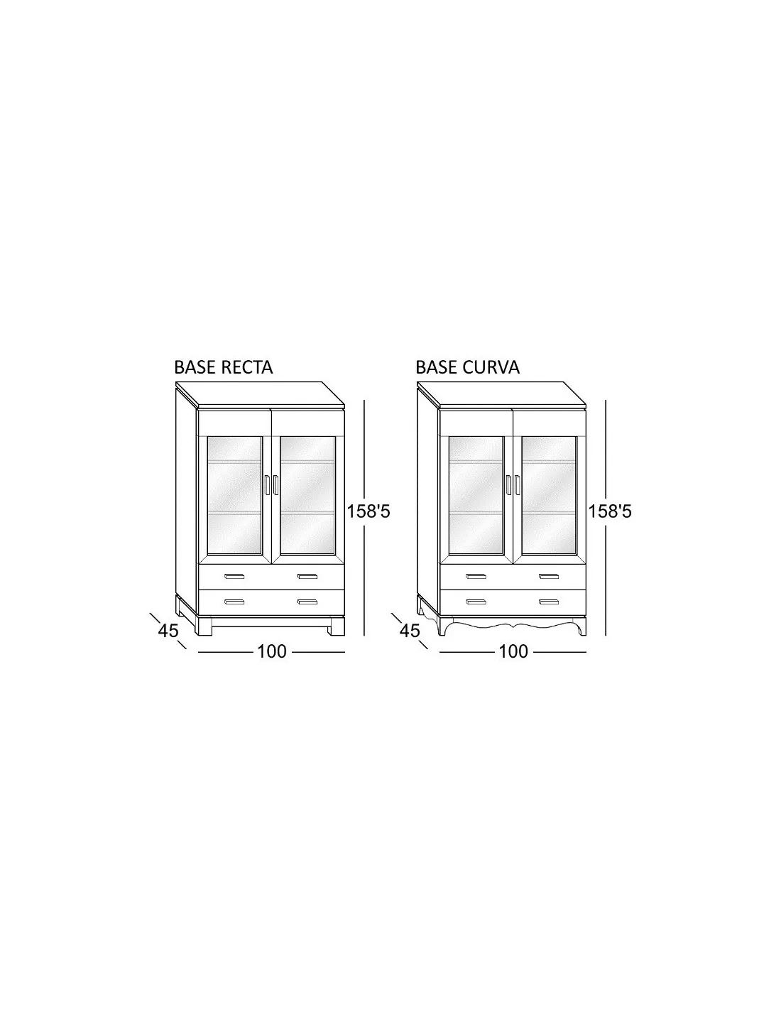 Este mueble vitrina baja con dos puertas y cajones tiene las siguientes medidas (alto x largo x fondo en cm.): 158,5 x 100 x 45.