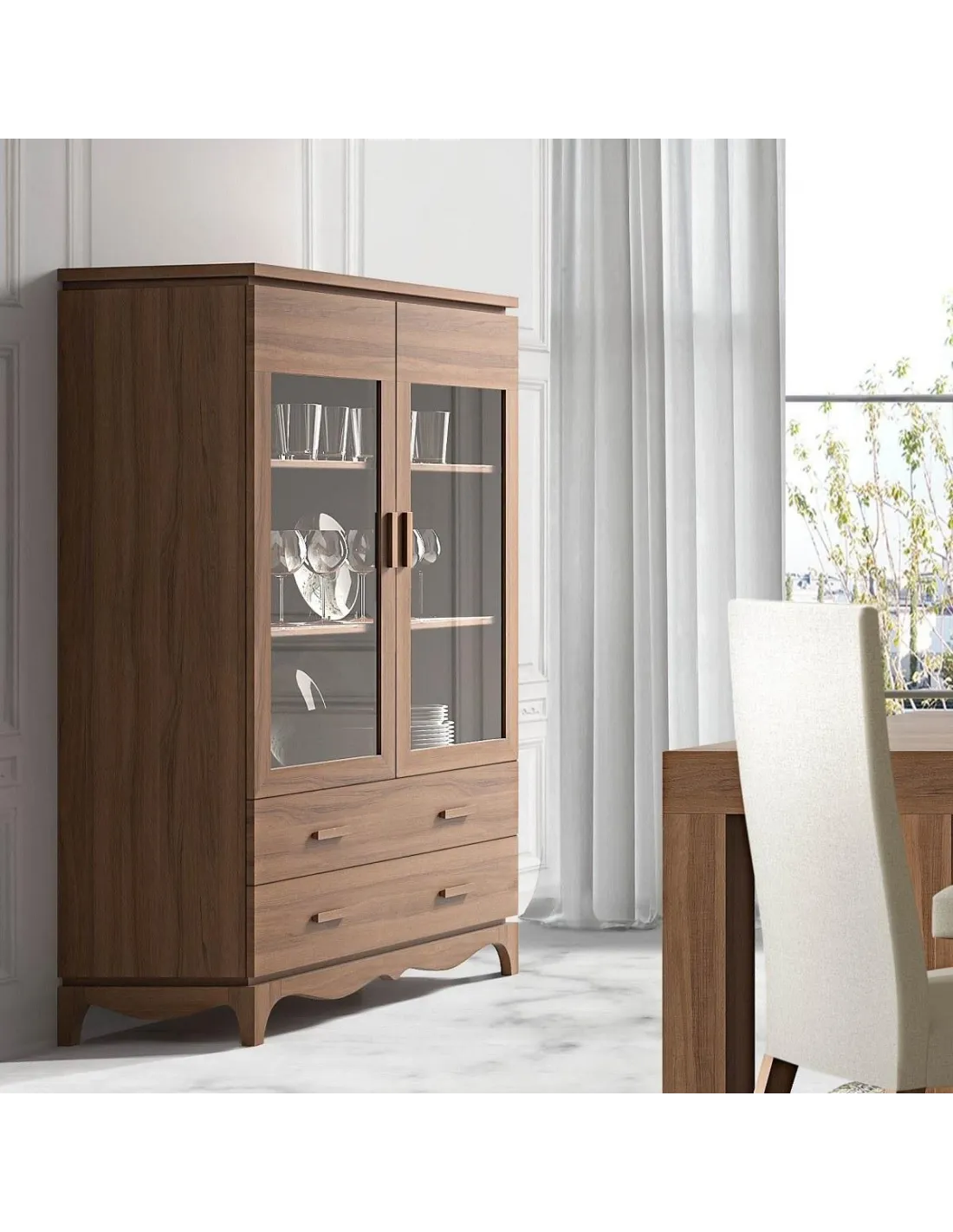 Esta vitrina con puertas y cajones se puede personalizar primero en su apariencia, pudiendo optar por una base de apoyo a suelo con acabado curvo o recto , lo cual nos da toques de diferencia en el mueble. Además, podrá elegir entre varios modelos de tirador al mismo precio