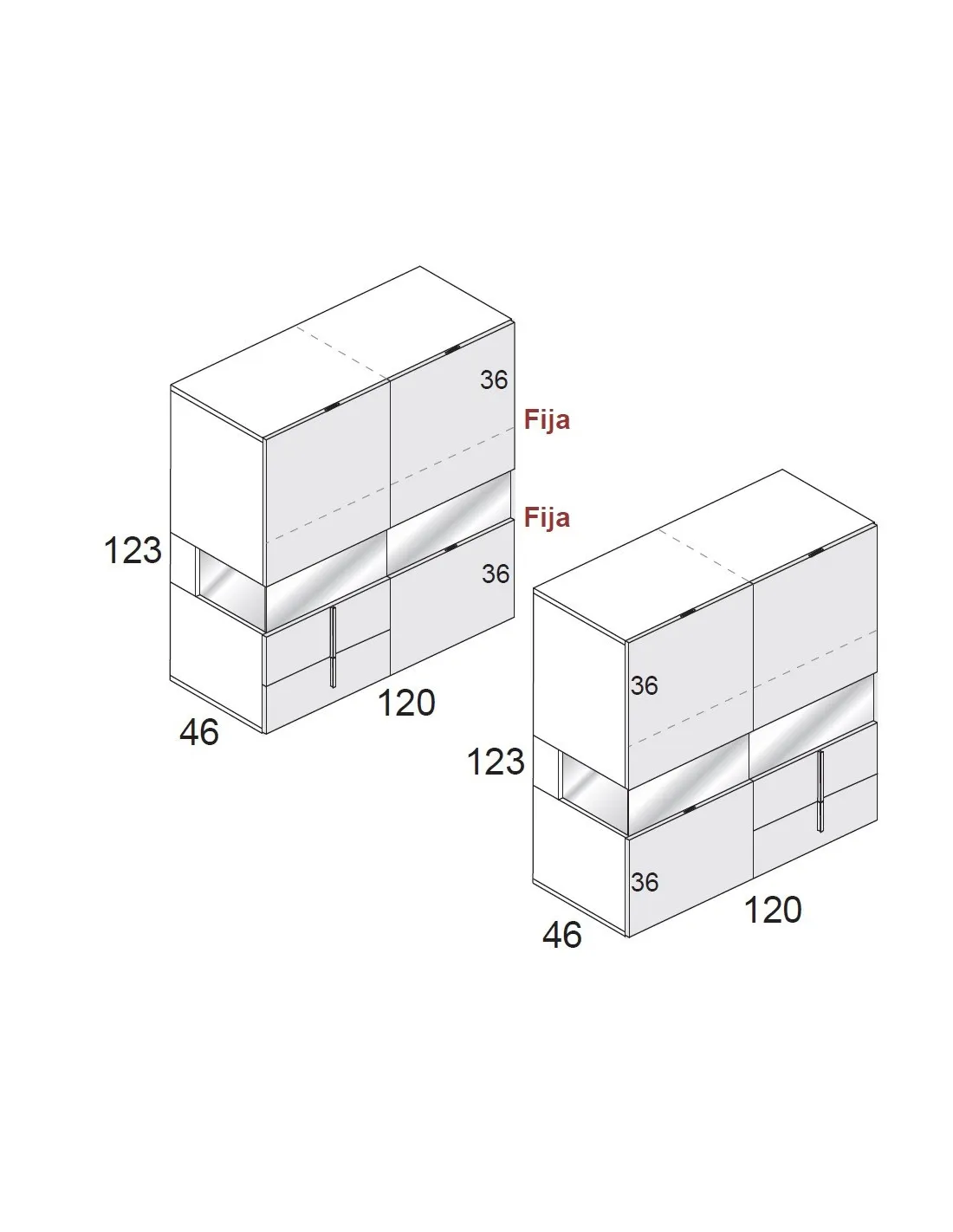 - Módulo bajo vitrina dos puertas horizontal con zócalo: 120 x 132 x 46 cm.