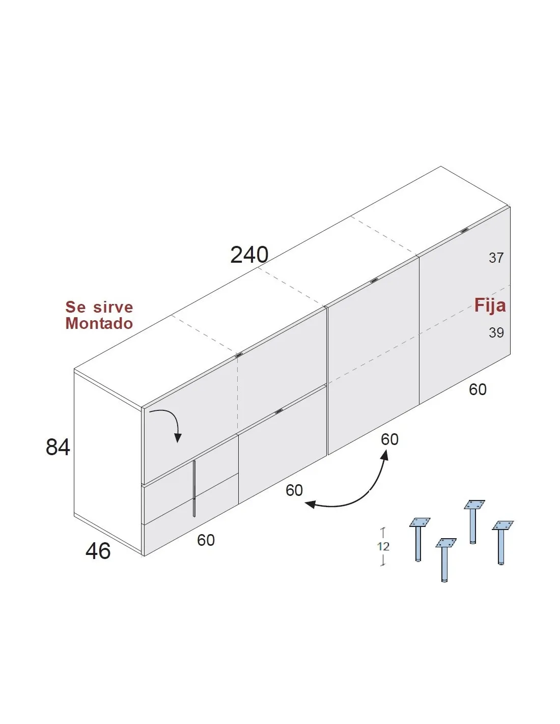 Tenemos opciones de catálogo que no están incluidas en esta ficha de producto pero que se puede optar pr configurar a su manera: tiradores, patas, medidas, módulos independientes... Todos los módulos del catálogo están disponibles para su venta por separado.
