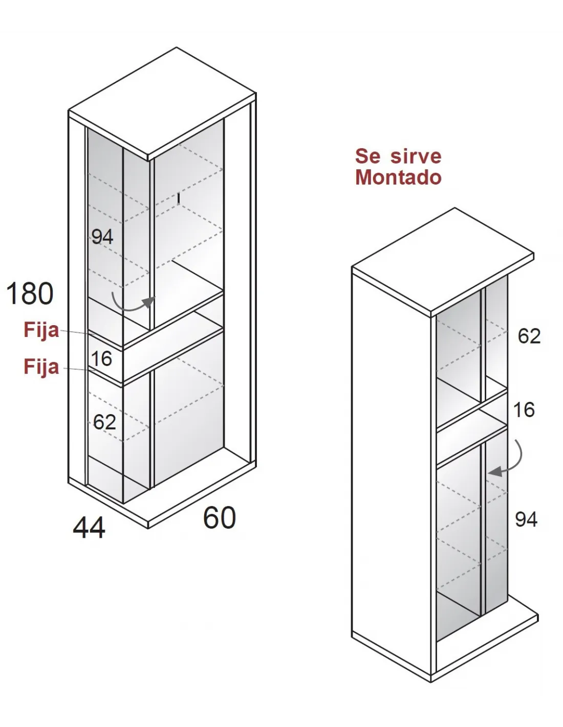 Este mueble vitrina C230 viene con las siguientes medidas en largo x alto x fondo (en cm.): 60 x 180 x 44.