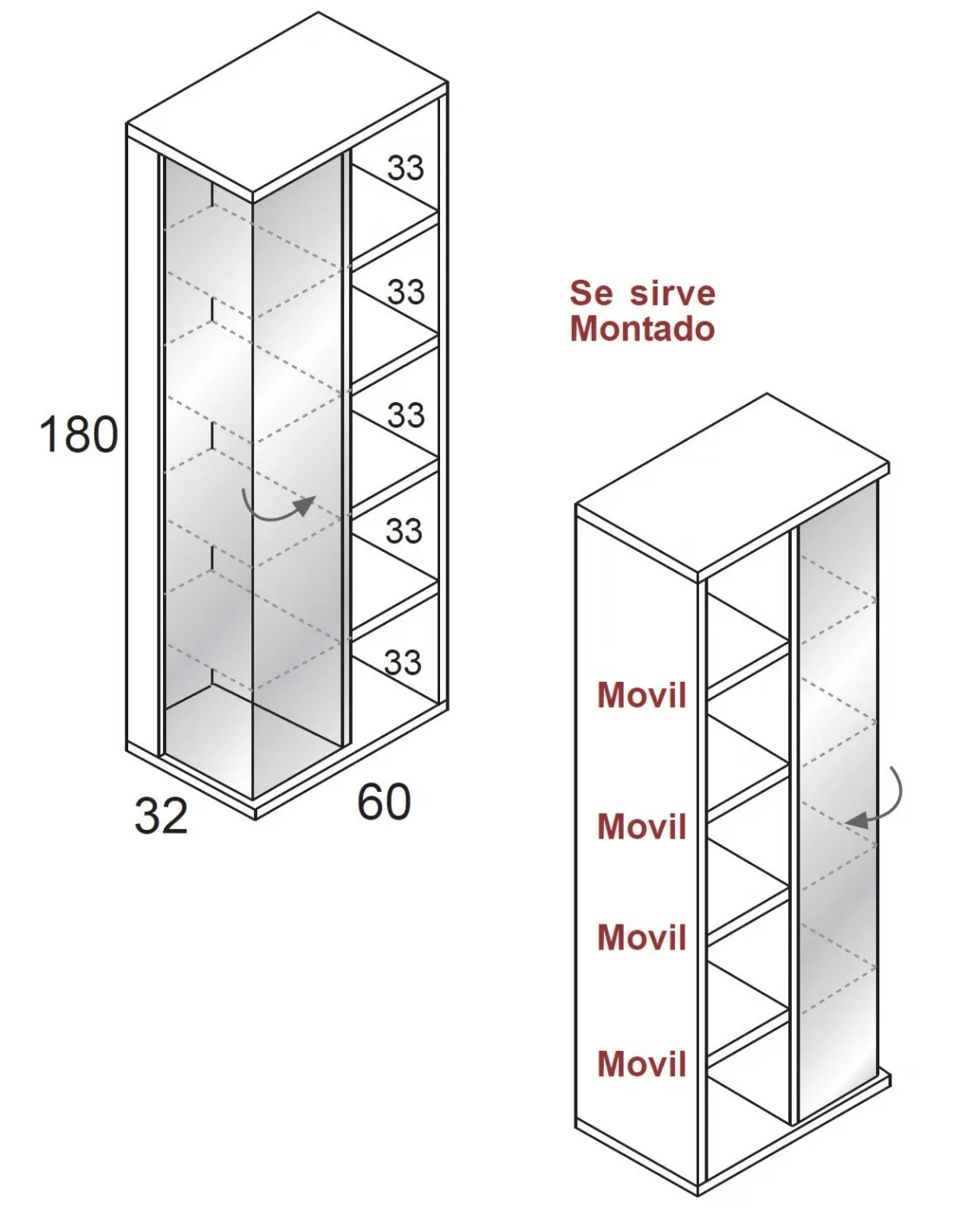 Este mueble vitrina C237 viene con las siguientes medidas en largo x alto x fondo (en cm.): 60 x 180 x 32.