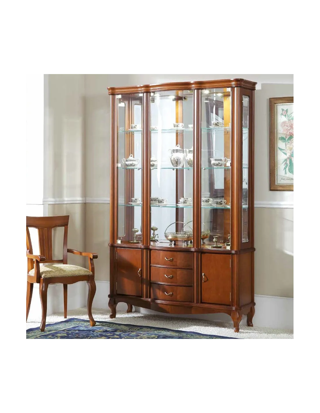 Vitrina de grandes dimensiones con patas fabricada en madera cerezo de diseño neoclásico