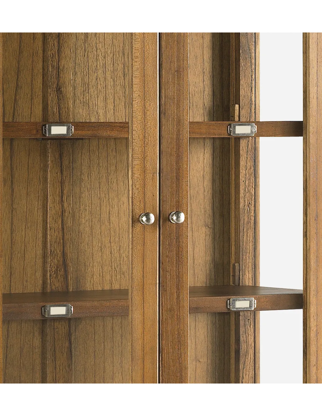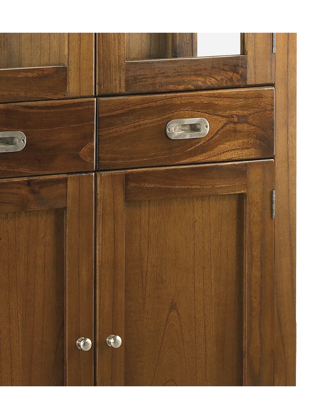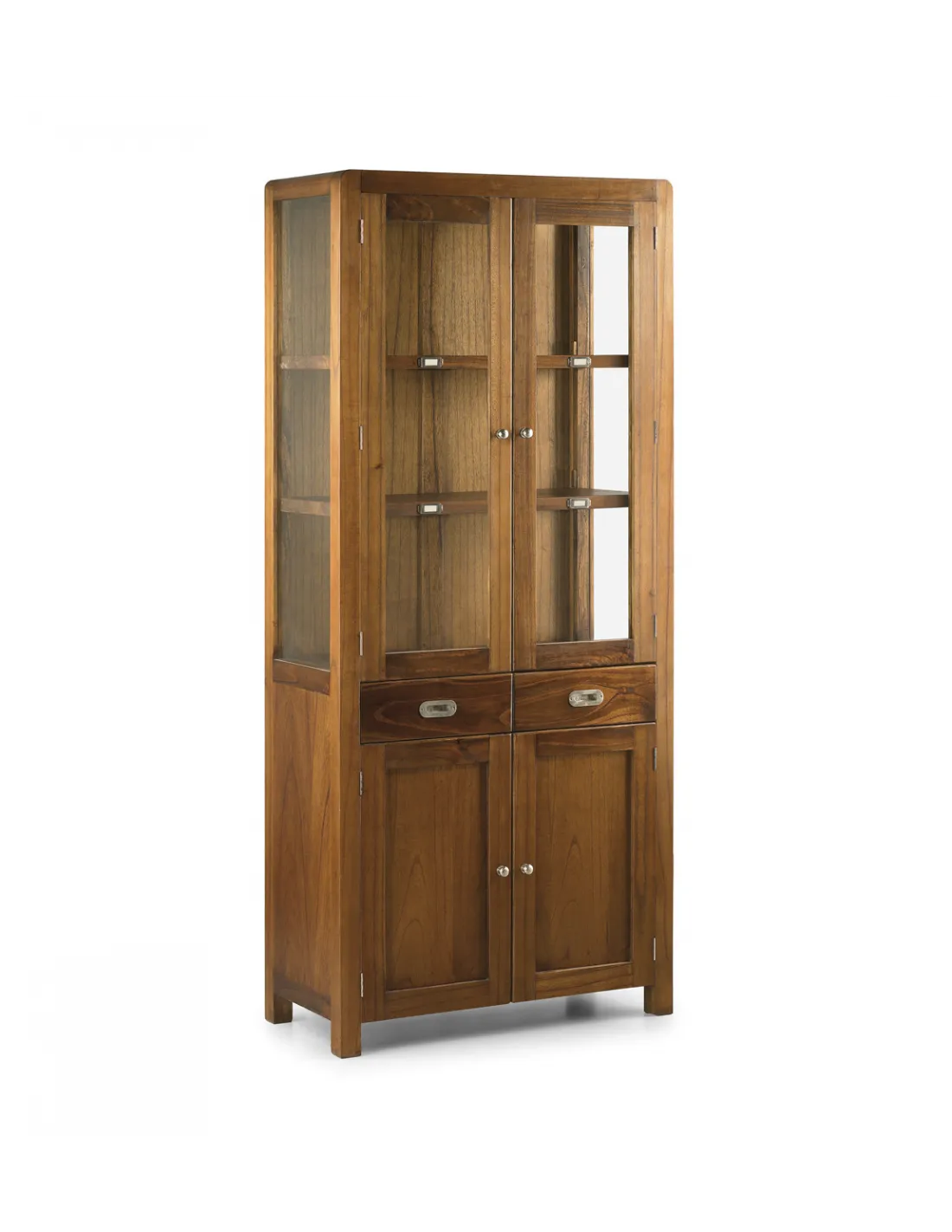 Vitrina fabricada en madera maciza de Mindi con inconfundible diseño colonial con cajones y puertas