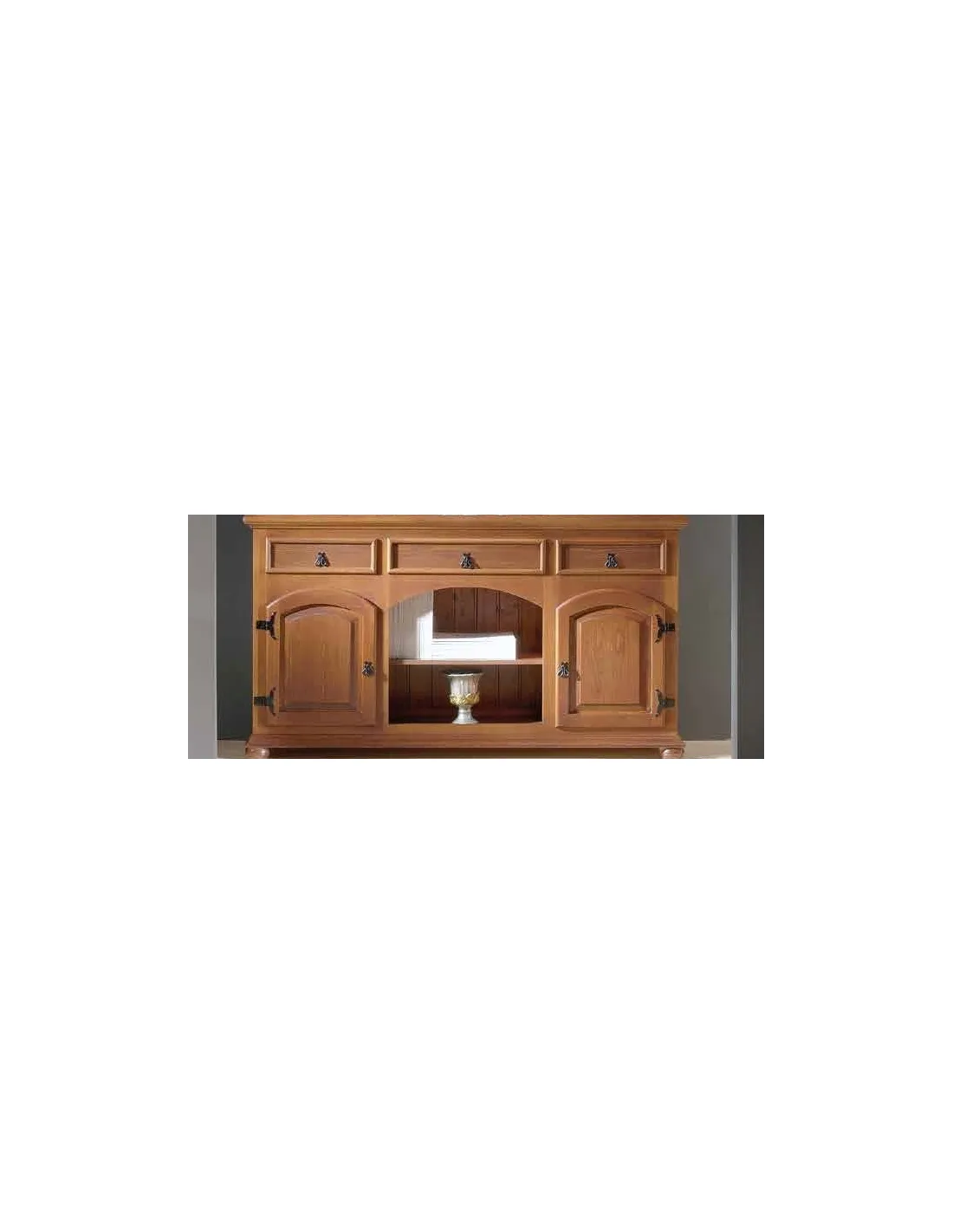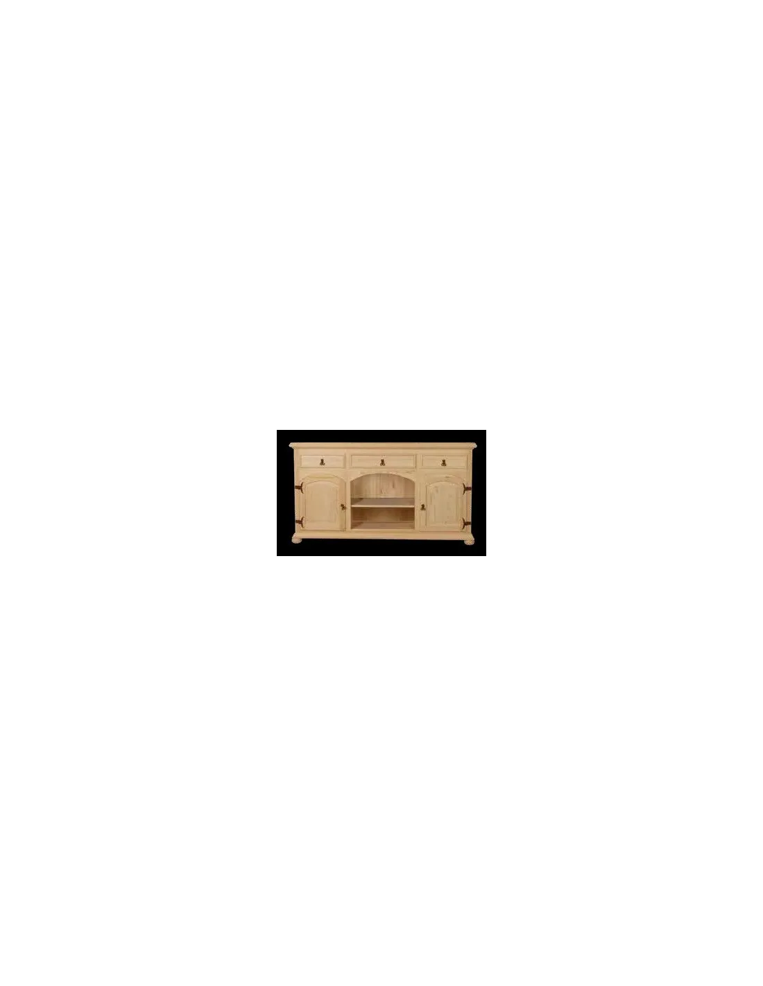 Este aparador rústico tiene dos puertas, huecos centrales y tres cajones en su parte superior. Está fabricado en madera con las siguientes medidas de largo x alto x fondo en cm.: